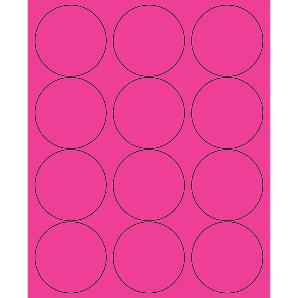 2 1/2″ Fluorescent Pink Circle Laser Labels. Use to create your own product or mailing labels. Labels work with both Laser and ink jet printers. Permanent adhesive. Labels stick to a variety of smooth surfaces including paper, corrugated, plastic, wood, glass and metal.