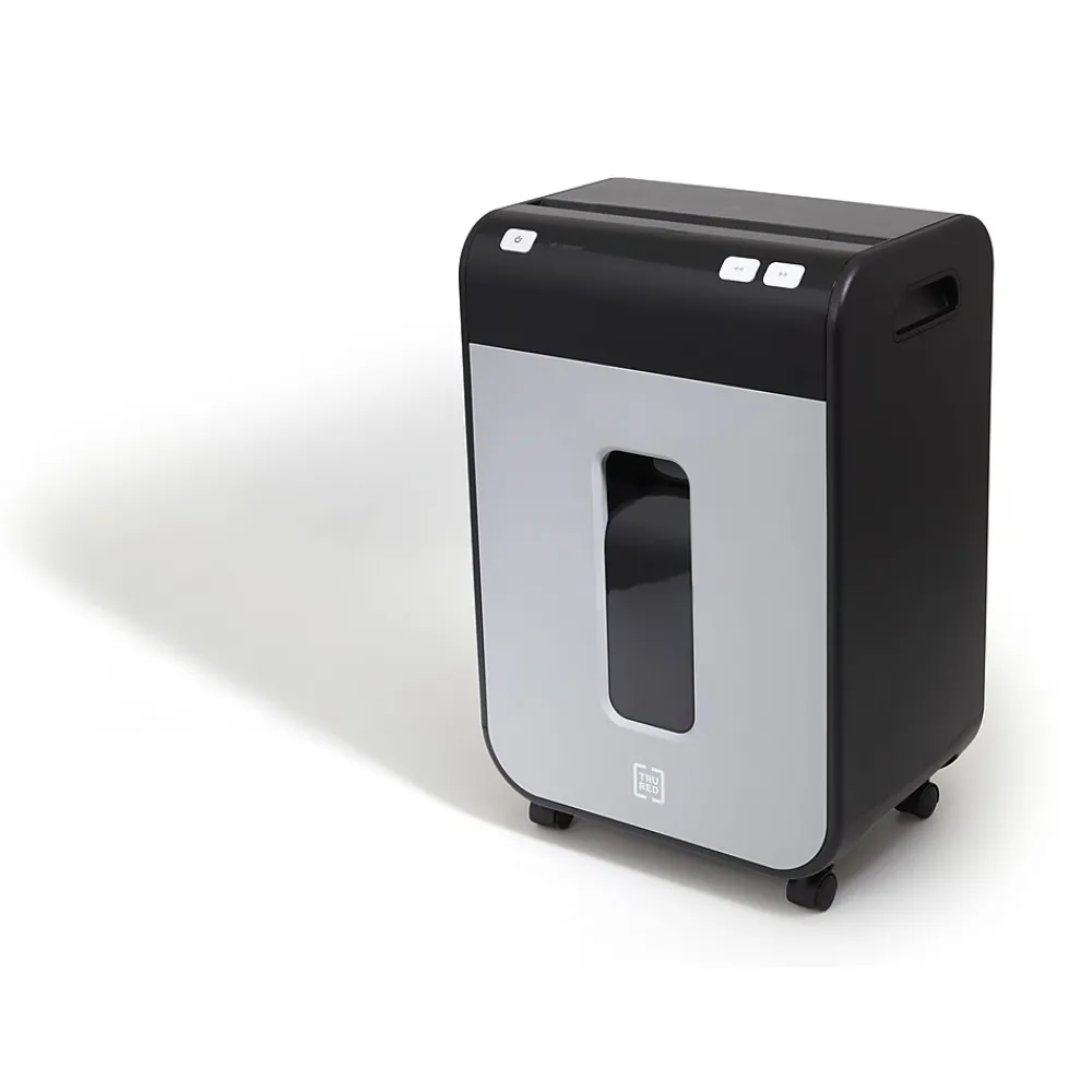 Dispose of unneeded documents with this TRU RED™ 10-Sheet Micro-Cut Commercial Shredder. Built with the demands of today’s offices in mind, this shredder features built in handles and dual casters for mobility, letting you position it where the task is at hand. Micro-cut blades reduce media to 4mm x 12mm particles keeping discarded data safe and secure. Perfect for smaller size projects or day to day needs, this TRU RED™ shredder handles the task.