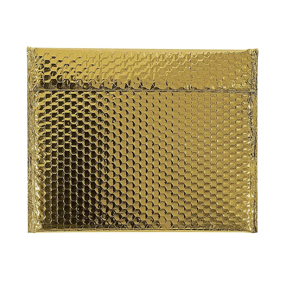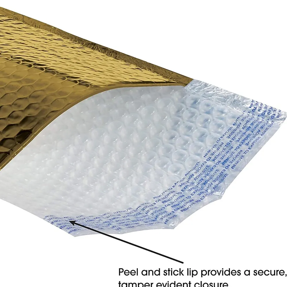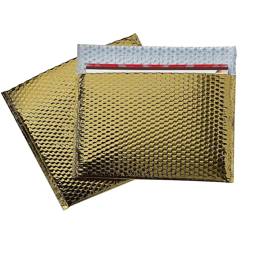 The 12 3/4″ x 10 1/4″ Glamour Bubble Mailer features a peel and seal adhesive closure as well as a shiny gold metallic exterior. Mailer is lightweight and offers moisture resistance.