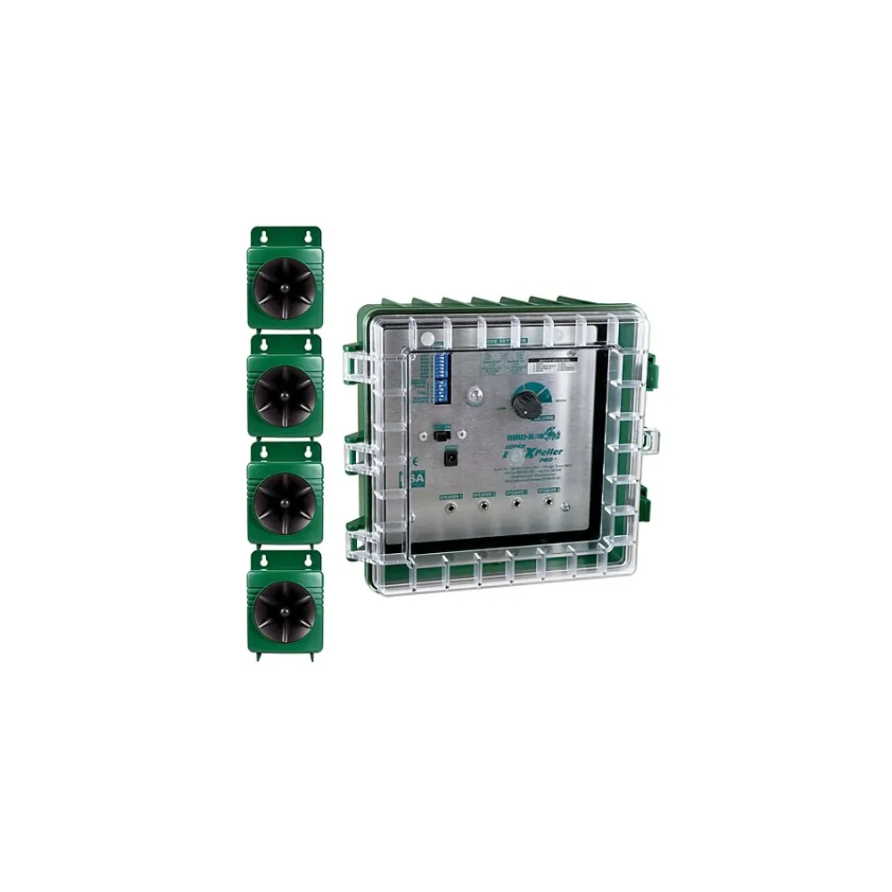 The Super BirdXPeller® PRO emits a variety of naturally recorded distress calls and predator cries that confuse, frighten, and disorient pest birds. Keep birds away up to 6 acres with four included weather-resistant speakers and customizable settings. Target birds with species-specific approach.