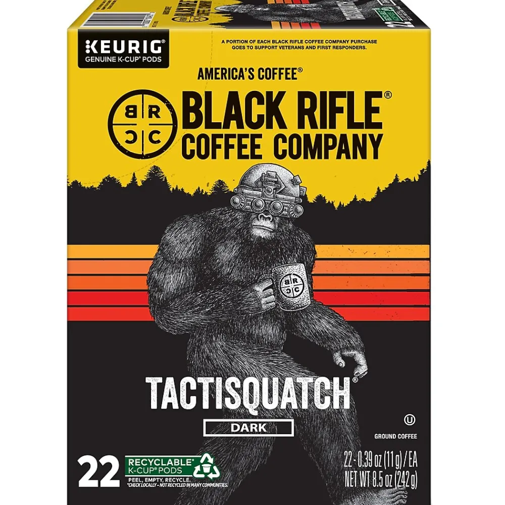 The rumors are true — the Tactisquatch now walks among us in single serve Keurig K-Cup pods! Tactisquatch is a Honduran Arabica dark roast coffee, offering tasting notes of black currant, molasses, and orange. The locals say you can find your friendly neighborhood Squatch wandering through the woods, out on the range, or boxed away in your pantry. It’s not easy finding the perfect beans to represent Black Rifle Coffee Company. We have scoured through the coffee powerhouses of the world to find high-quality coffee beans to deliver a full-flavored taste no matter how you take your coffee. So every one of our Tactisquatch K-Cup pods gives you the perfect cup, every cup. Black Rifle Coffee Company serves coffee and culture to people who love America. We develop our explosive roast profiles with the same mission focus we learned as military members serving this great country, and we are committed to supporting veterans, law enforcement, and first responders. Each Tactisquatch K-Cup pod is filled with freshly ground coffee beans and is compatible with all Keurig single serve coffee makers. Simple. Delicious. And recyclable. Enjoy the same great-tasting coffee you know and love, and when you’re done, just peel, empty, and recycle.Check locally, not recycled in many communities.