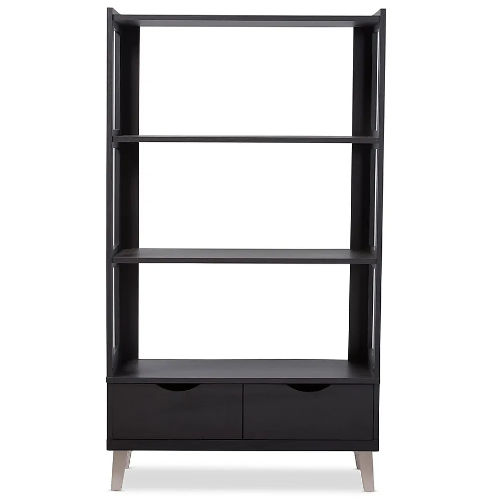 Simple and architectural, the Kalien dark brown wood leaning bookcase is reminiscent of modern and contemporary design.The Kalien’s clean and functional design features powder coated vinyl legs supporting the framework of the bookshelf.