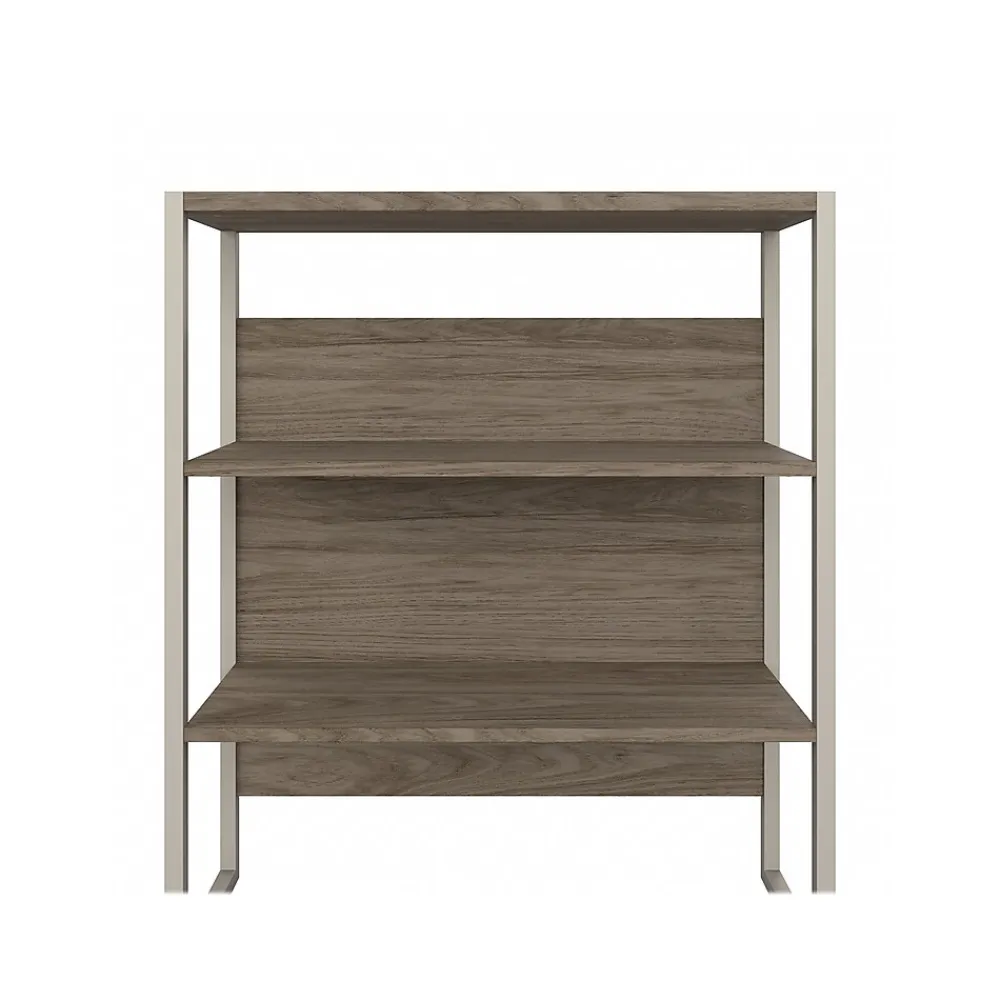 The Bush Business Furniture Hybrid tall etagere bookcase offers a stylish, long-lasting storage and display solution for the modern professional. Organize books and other reference materials, or decorate your workspace to give it a personal touch on shelves that support up to 50 lbs. each. The lower section contains one fixed shelf for stability and another that can be raised or lowered to accommodate items of various sizes. The open shelves are perfect for storing a small library or showcasing your favorite plants, pictures, and knickknacks. The tall bookcase’s stable design and included wall attachment hardware make it a safe choice for use in virtually any home or professional office environment. Find the perfect look for your space with five contemporary finish options: black walnut, modern hickory, platinum gray, storm gray, and white. This five-shelf bookcase has been meticulously tested to meet or exceed ANSI/BIFMA quality standards for safety, durability, and performance and is backed by the Bush Business Furniture 10-year manufacturer warranty. See the full Bush Business Furniture Hybrid collection for coordinating items to enhance your workspace as needed, including computer desks, file cabinets, and storage cabinets (coordinating items sold separately). American-made with US and imported parts.