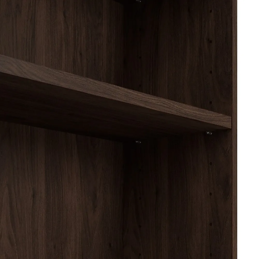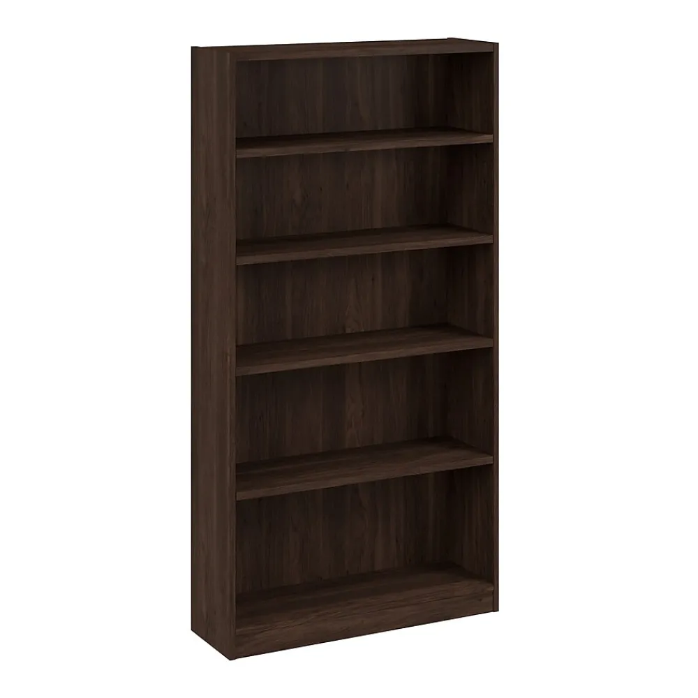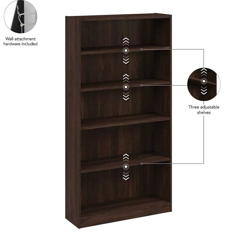 The Bush Business Furniture Vista Tall 5 Shelf Bookcase keeps any office or workspace organized and clutter-free, adding a modern touch and extra storage where it’s needed. Three adjustable shelves move up and down while two fixed shelves offer added stability and provide extra storage. The sturdy 1-inch thick shelves have a weight capacity of 50 pounds each, so storing paperback and hardcover books, vinyl records, DVDs or video games is never a problem. Wall attachment hardware is included for family-friendly safety and security in a home office or living room. Available in your choice of contemporary finishes. This tall 5 tier bookshelf has been meticulously tested to meet or exceed ANSI/BIFMA quality standards for safety and performance and is backed by the Bush Furniture 10 Year Manufacturer’s Warranty.