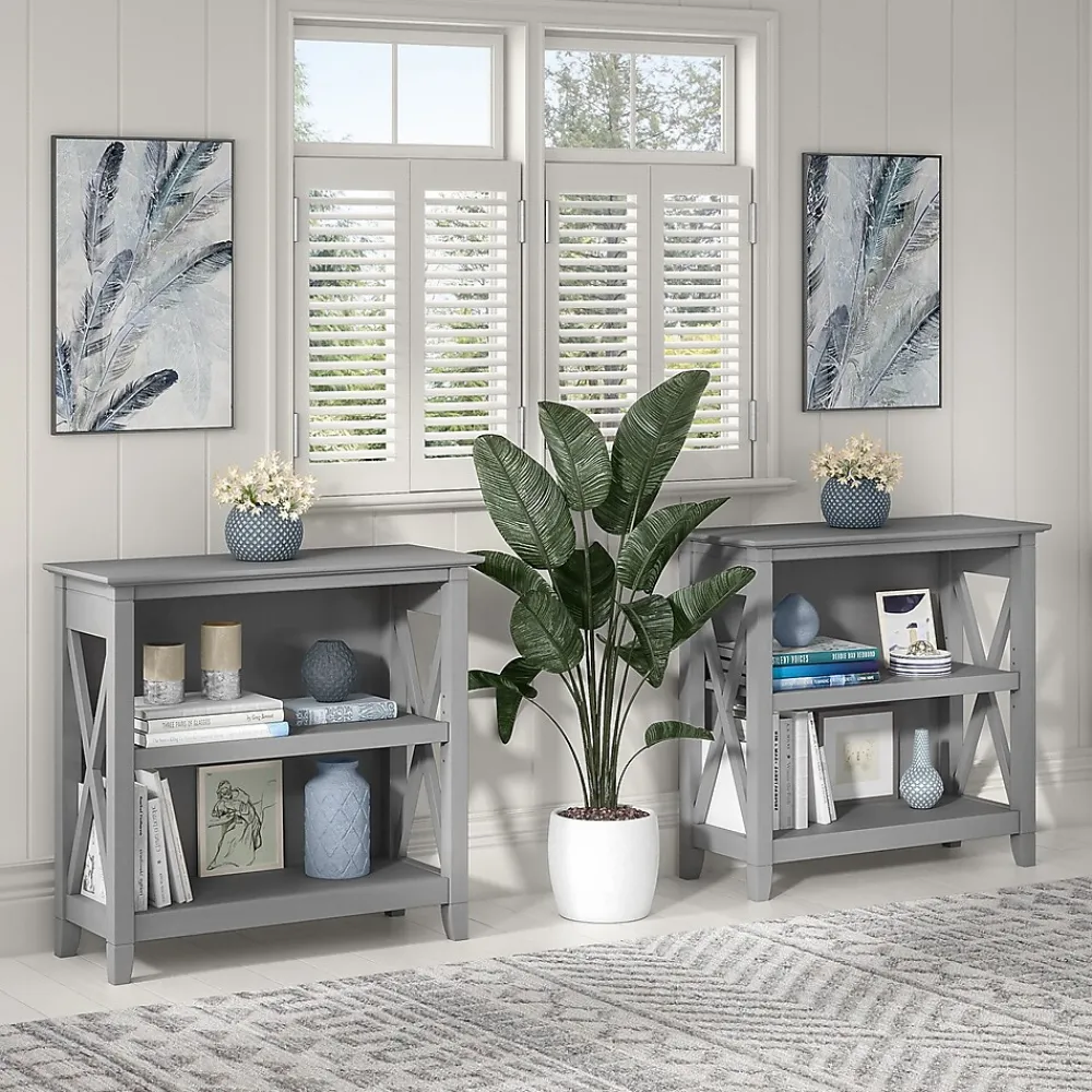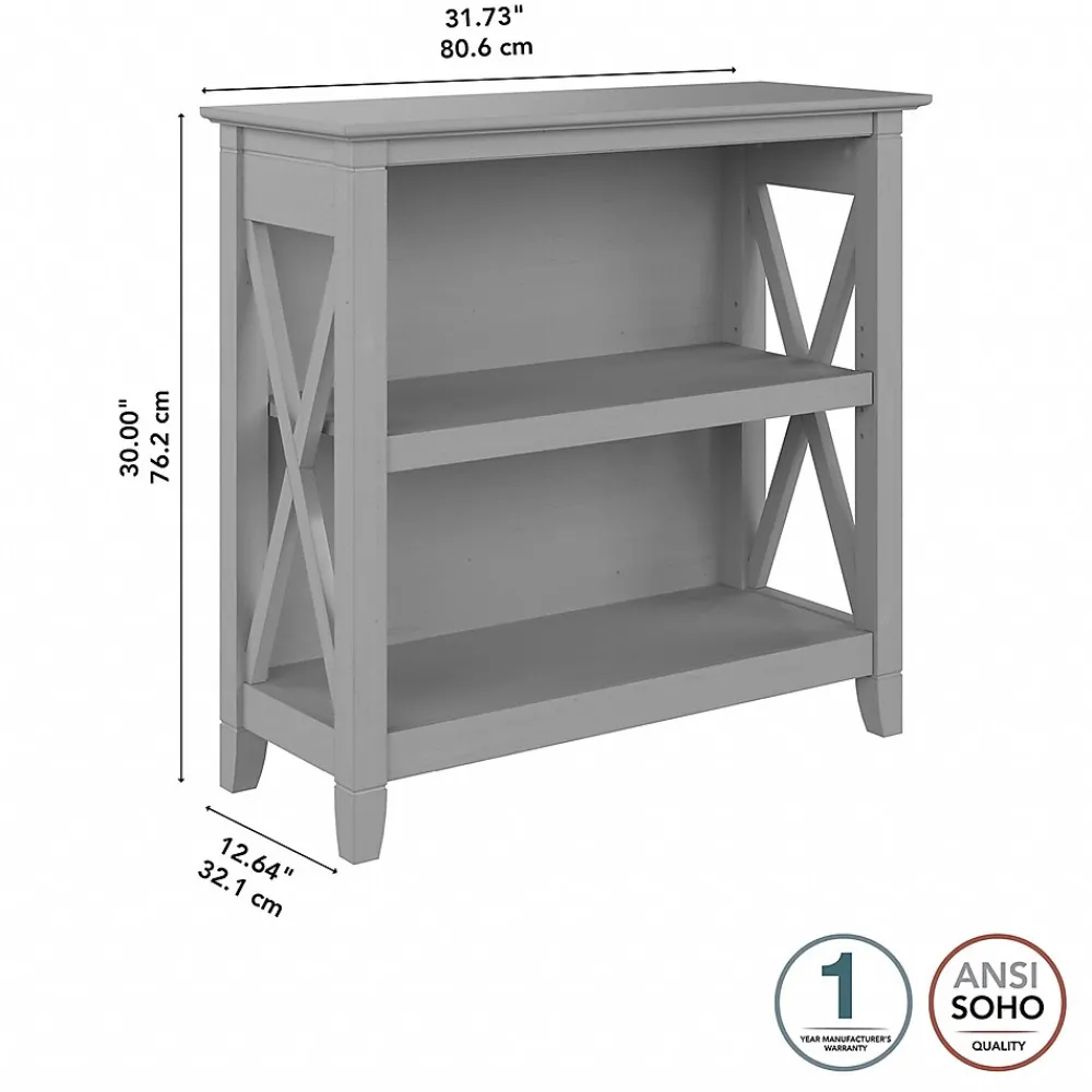 The Bush Furniture Key West small two-shelf bookcase offers a practical storage and display solution that gives your home a touch of casual style. This small bookshelf features a compact, versatile design that makes it a perfect choice for use in a home office, living room, entryway, or virtually any other residential space. One fixed shelf and one adjustable shelf accommodate books, reference materials, and decorations of various sizes. Each shelf supports up to 35 lbs., so you can store and display larger items with confidence. A post leg design and X-pattern accents convey a casual appearance that works well with cottage, coastal, and modern farmhouse style. This small bookcase has been tested to meet ANSI/SOHO quality standards for safety and performance and is backed by a 1-year warranty. See the full collection for coordinating items available.