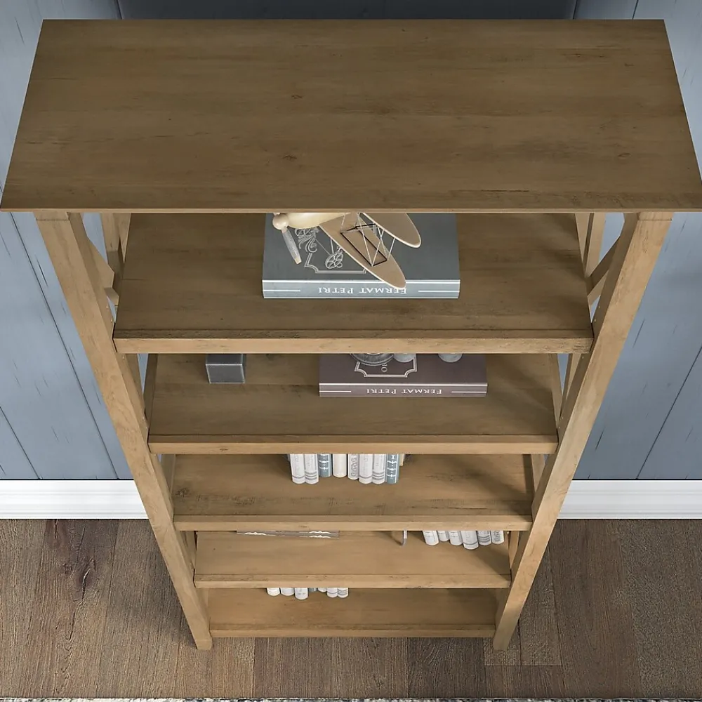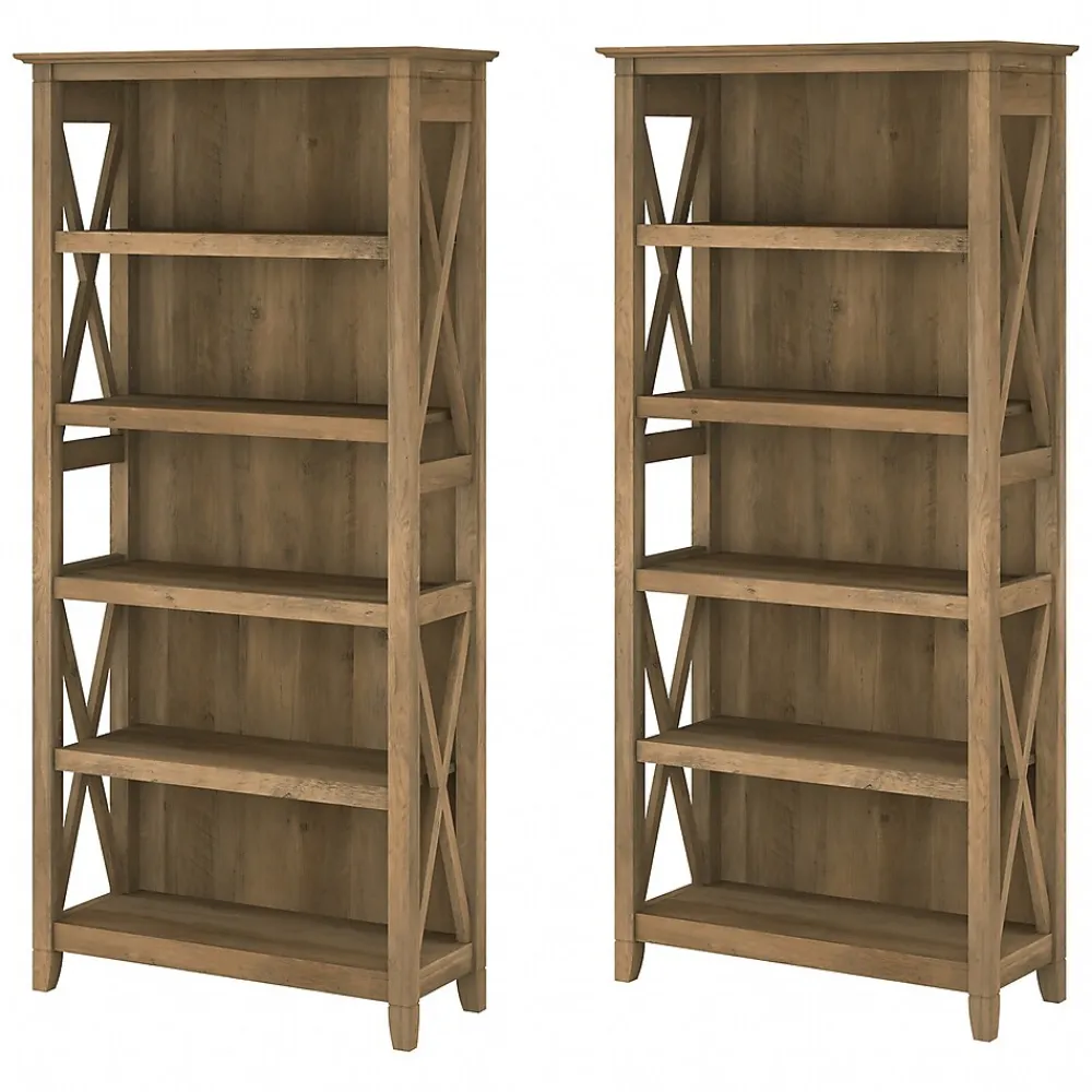 The Bush Furniture Key West tall five-shelf bookcase set is a perfect way to show off your favorite artwork, photos, plants, and more. These matching bookcases each include three adjustable shelves to accommodate items of various sizes and two fixed shelves for stability. Each shelf supports up to 50 lbs. so you can store your collection of paperback and hardcover books or display decorations with confidence. Place the tall bookshelf set side by side to create a storage wall or position them separately based on the needs of your space. Stylish touches include X-pattern accents on the side panels as well as a sturdy and attractive post-leg design. Wall attachment hardware is included for family-friendly safety and security in any home office or living room. These five-shelf bookcases are tested to meet ANSI/SOHO quality standards for safety and performance and are backed by a 1-year manufacturer warranty.