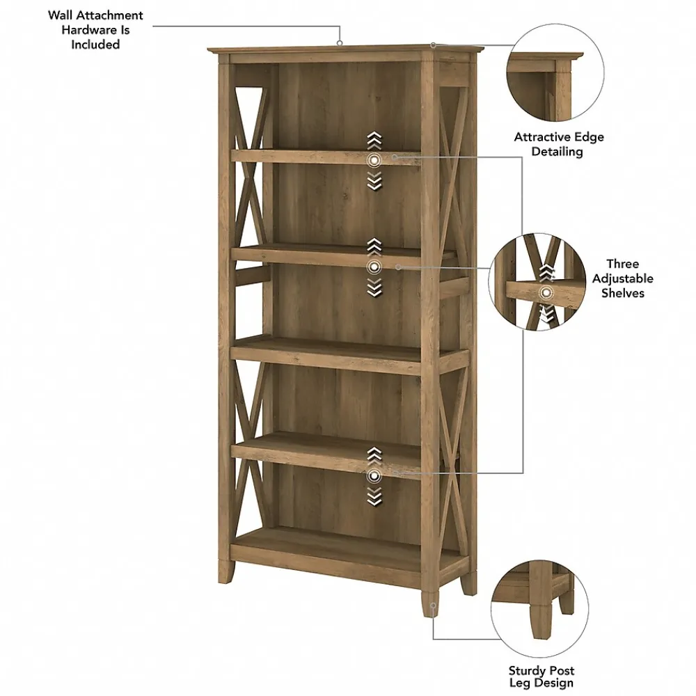 The Bush Furniture Key West tall five-shelf bookcase is a perfect way to show off your favorite artwork, photos, plants, and more. Three adjustable shelves accommodate items of various sizes while two fixed shelves provide stability. Each shelf supports up to 50 lbs. so you can store your personal library and display decorations with confidence. Stylish touches include unique X-pattern accents on the side panels as well as a sturdy and attractive post leg design. This five-tier bookcase includes wall attachment hardware for family-friendly safety and security in any home office or living room. A perfect choice for homes that embrace cottage, coastal, and farmhouse decor, the Bush Furniture Key West collection includes a variety of coordinating items to expand your space as needed. This tall bookcase is tested to meet ANSI/SOHO quality standards for safety and performance and is backed by a 1-year manufacturer warranty.