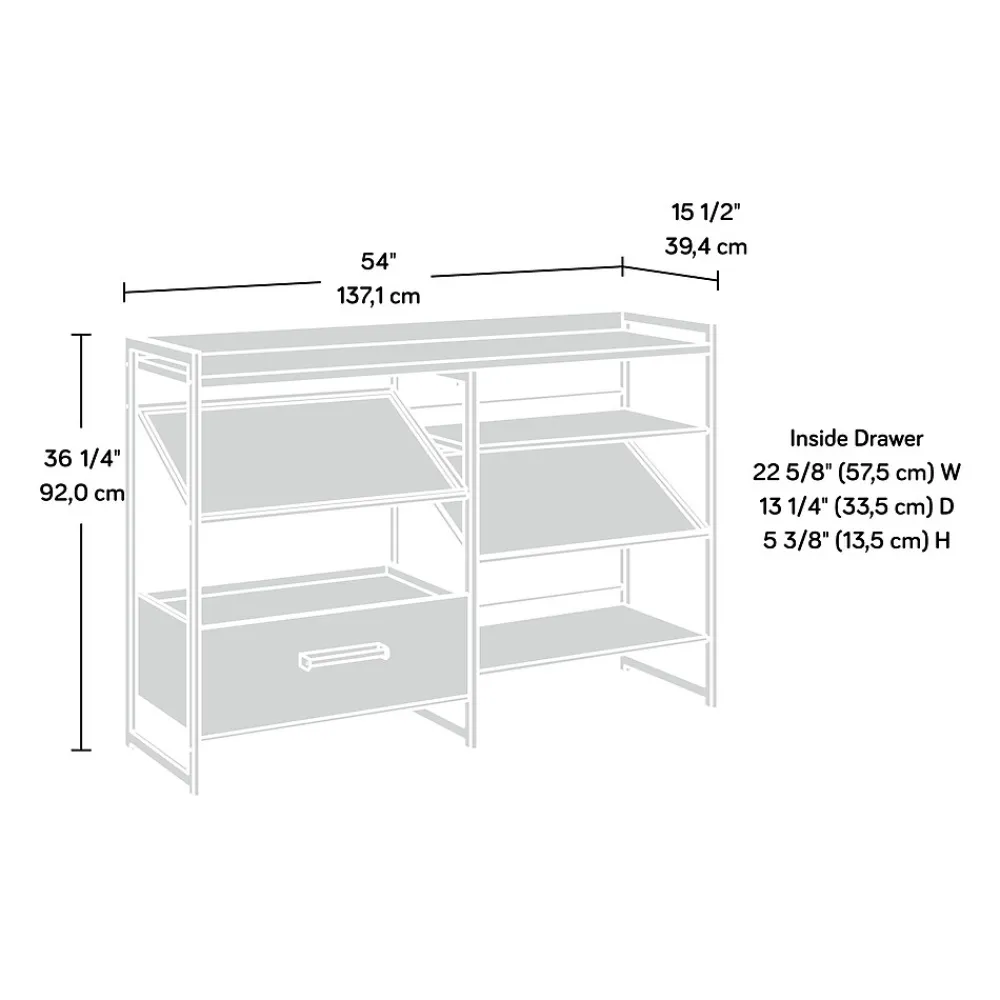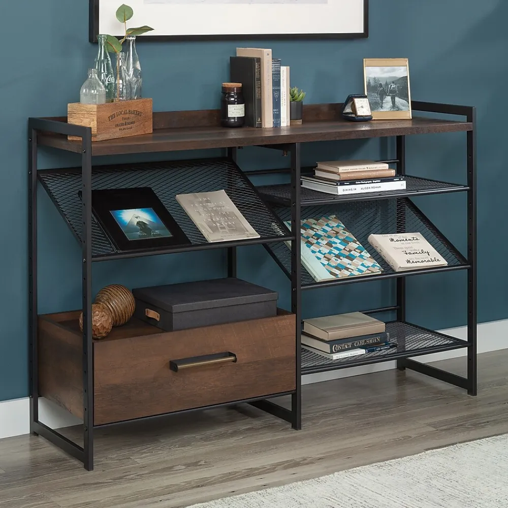 A unique bookcase for your unique needs. This bookcase with drawer from the Briarbrook collection is the distinctive element your home has been missing. This bookcase with storage features a drawer with metal runners and safety stops that can hold a variety of items: office supplies, writing materials, and general storage. The top surface of this display bookcase features a cornered edge for displaying home decor and photos of your family. This bookshelf with drawer features shelves that can be tilted for displaying books, magazines, artwork, and photos. A highly configurable design allows for customizable placement of shelves and drawer, all according to your personal preference. This bookcase with shelves is finished on all sides for versatile placementit will look polished and complete from every angle. Finished in Barrel Oak with powder coated metal shelves and frame, this modern bookshelf will catch the eye of guests, and make you proud of your purchase.