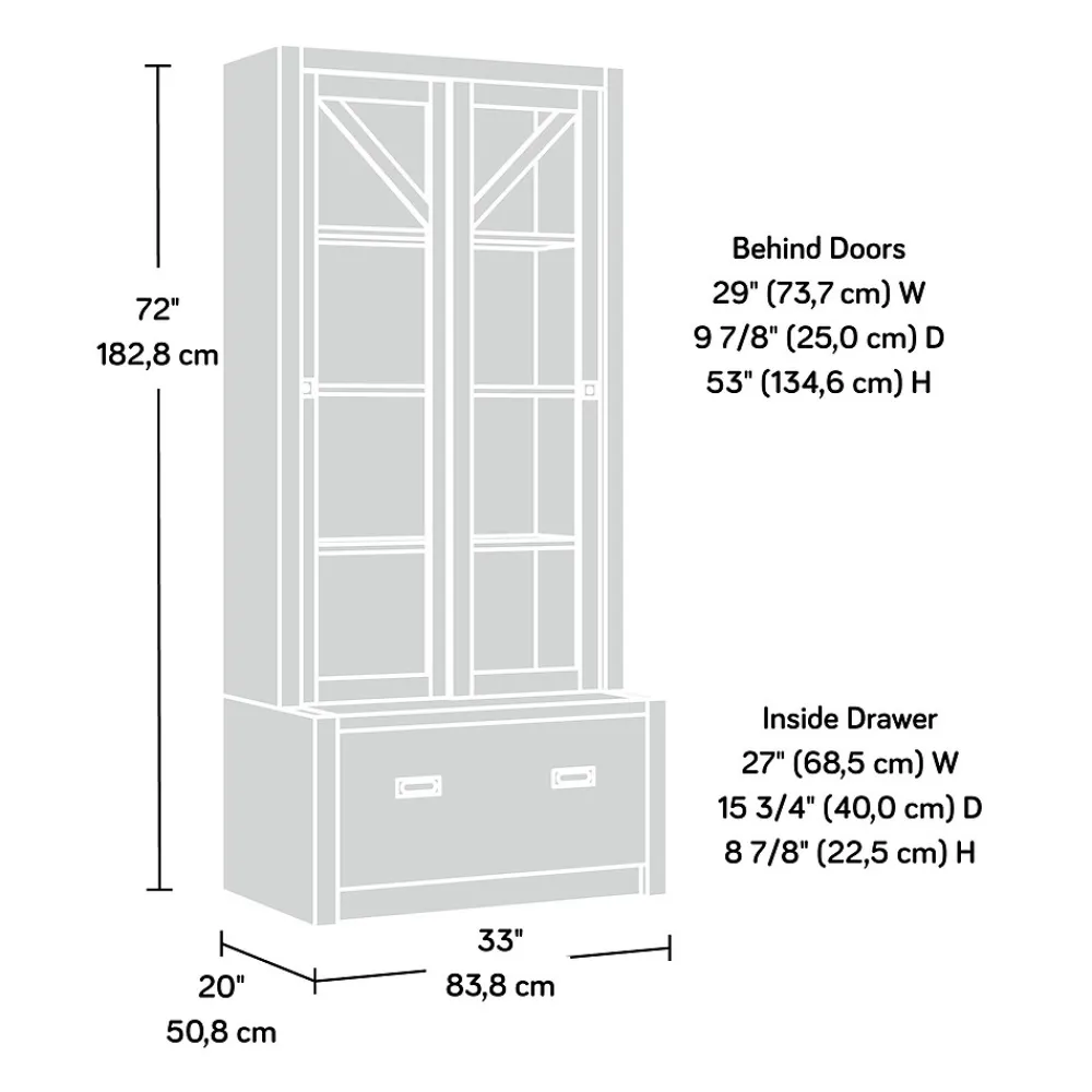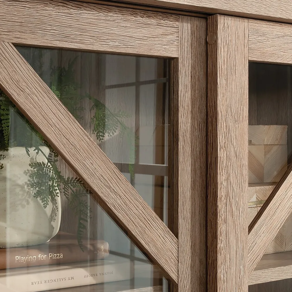 The bookcase with sliding doors from the Dixon City collection has a rustic farmhouse appeal coupled with a touch of contemporary style. Finished in the natural tone of Brushed Oak with Pebbled White accent, the diagonal trestle detailing at the top of the glass doors lends an architectural element to the otherwise simple design. The safety-tempered glass sliding doors of this commercial bookcase open to reveal two adjustable shelves and a fixed shelf, designed to stylishly meet ever-changing storage demands. At the bottom of the bookcase with doors is a file drawer with full extension slides that will hold legal or letter size hanging files. This residential office furniture has strong and lightweight panel construction for added style and versatility of placement within your home office. This 4-shelf bookcase meets BIFMA standard x5.9 for safety, durability, and structural performance. Hardware with a rubbed bronze finish adds a touch of glam to this office storage bookcase, for the ultimate modern farmhouse meets luxury appeal.