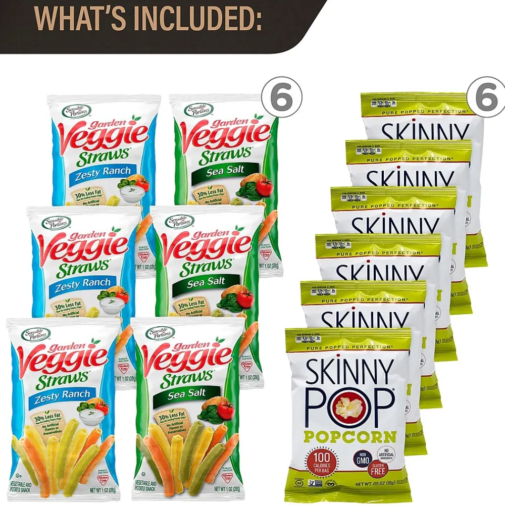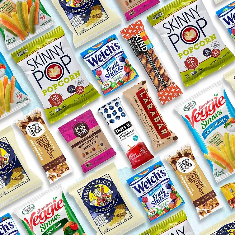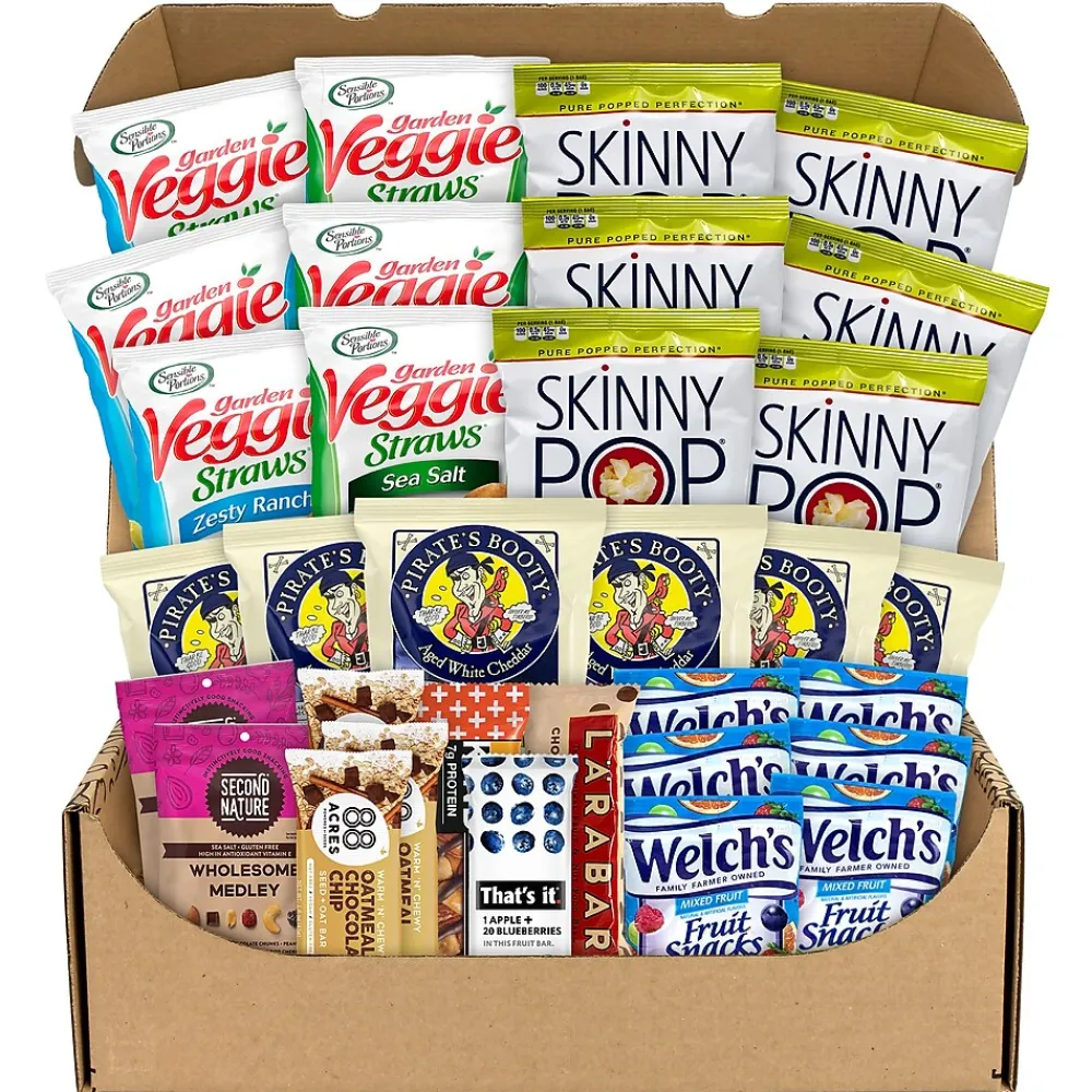 - Each box contains: six Skinny Pop 100 Calorie, six Sensible Portions Veggie Straw, six Pirates Booty, two Second Nature Naked Medley, one Kind Nuts & Spices Bars Variety, one That’s It Apple+Blueberry Fruit Bars, three 88 Acres Granola Bars, one Larabar Variety, six Welch’s Mixed Fruits Snacks