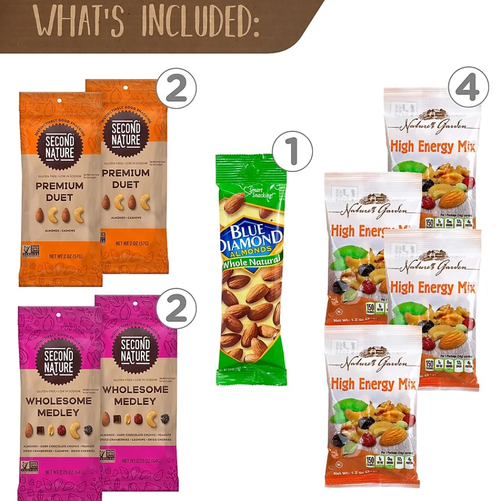 - A 19-Pack Snack Box filled with delicious bags of Mixed Nuts