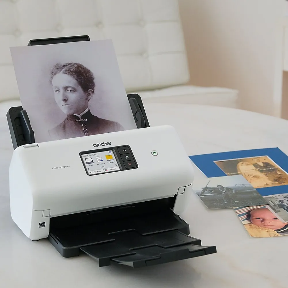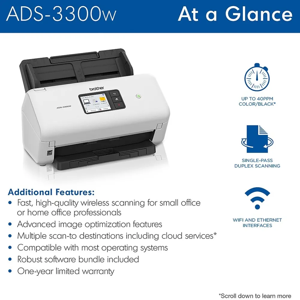 Small but mighty, the easy-to-use, affordable, and efficient Brother ADS3300W is a powerful addition to any small business or home office workspace. A versatile and reliable solution for mid-volume scanning, the machine scans to multiple destinations, and offers a range of connectivity options, including wireless/wired fast Ethernet network connectivity, or via the Brother Mobile Connect application for iOS and Android. Engineered for exceptional ease of use with a 2.8″ color touch screen, the ADS3300W performs single- or dual-sided document scanning, with an impressive capacity of up to 60 pages via the built-in auto document feeder with additional page-continuous scanning. Spend less time waiting and more time scanning. With a speed of up to 40 ppm, the scanner quickly handles a wide variety of media types and paper sizes, including legal-size and long paper, business, and plastic ID cards, receipts, and even photos. Bid farewell to frustration, and remove the guesswork from scanning with the built-in auto size detection. Seamlessly transition from scanning smaller items like business cards to longer documents like legal contracts at the touch of a button.