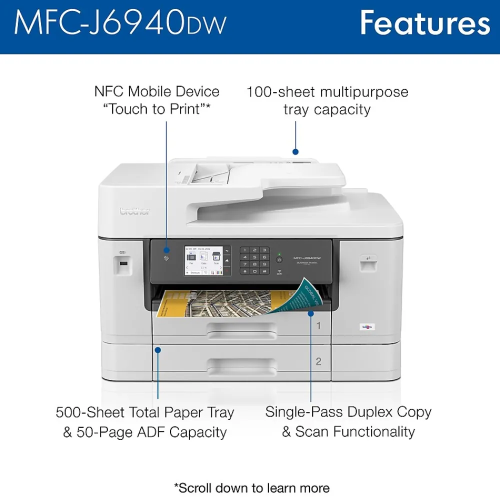 The Brother MFC-J6940DW color inkjet all-in-one printer delivers the functionality your office needs for optimum business performance. Print professional quality text and graphic documents at print speeds up to 28ppm(1) (black and color). A smart choice for businesses that need a printer to handle mixed media sizes; two, 250-sheet capacity paper trays(2) offer flexibility to print, copy, scan and fax on paper up to 11”x17″ (Ledger) size. Raising the bar with single-pass duplex copy and scan functionality. Use convenient NFC mobile printing(3) or access features on the go with the free Brother Mobile Connect App(4). Whether you print a little or a lot, our convenient Brother Refresh EZ Print Subscription Service erases the worry of running out of ink. The Brother MFC-J6940DW color inkjet All-in-One printer offers reliable, professional-quality printing for any small work group or small business.