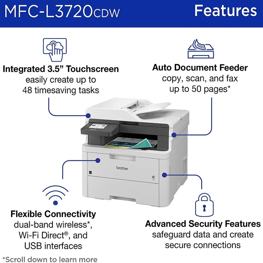 Ready to meet the requirements of your small office with quick, dependable operation and a host of useful features and functions. With impressive efficiency, it consistently creates clear smudge-free documents and achieves prints speeds up to 19 pages per minute (ppm)(1) and scan speeds up to 29/22 images per minute (ipm)(2) (black/color). Versatile paper handling and steady connectivity options are designed to help you work smarter and with fewer delays or interruptions throughout your day. The intuitive integrated 3.5” touchscreen helps simplify frequently performed tasks with custom shortcut options, and connects users to a dynamic assortment of Cloud-based apps.(3) Advanced security features establish secure connections to devices and networks and protect sensitive information while printing. Engineered and supported by Brother, the MFC-L3720CDW is a hard-working, reliable addition to any small office or business.