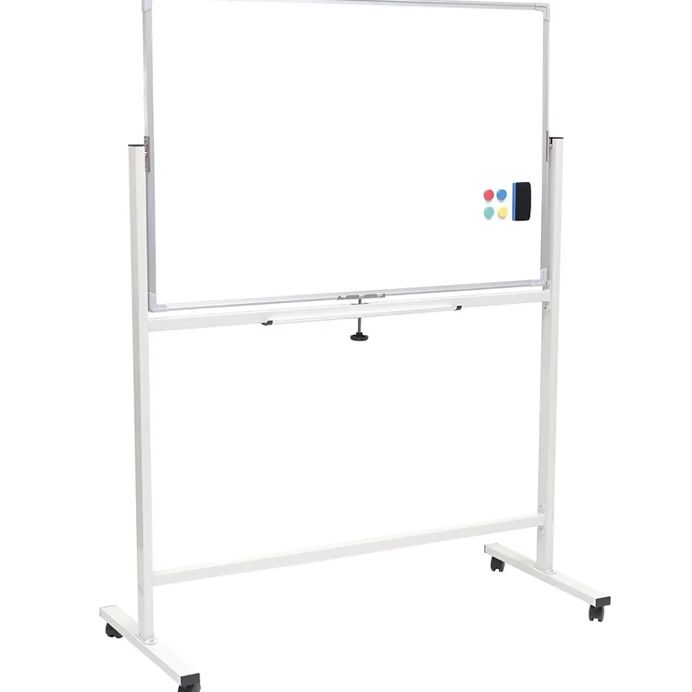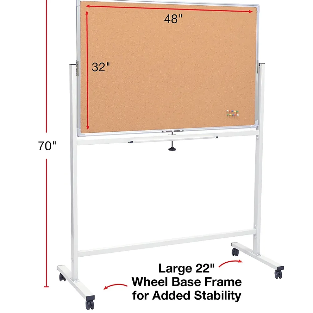 Our 48″ x 32″ Reversible Rolling Magnetic Whiteboard and Corkboard offering a flexible and versatile writing surface for various uses like teaching, planning, or presentations. Built with a robust yet lightweight steel frame, a 20-inch wide wheelbase, and four locking casters, this board ensures effortless mobility and secure positioning during use.