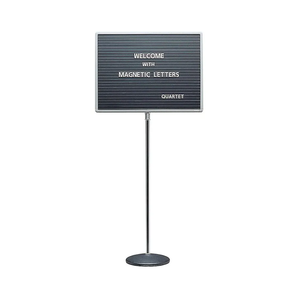 Personalize public messages with this versatile pedestal letter board. This letter board has a weighted base that keeps it from tipping over in high-traffic areas and its adjustable height lets you customize the pedestal to suit different environments. This letter board has a magnetic surface lined with horizontal ridges allowing magnetic letters to be quickly and efficiently affixed. With its modern gray aluminum frame, this Quartet adjustable pedestal magnetic letter board is a sturdy display option for businesses, offices, and public facilities.
