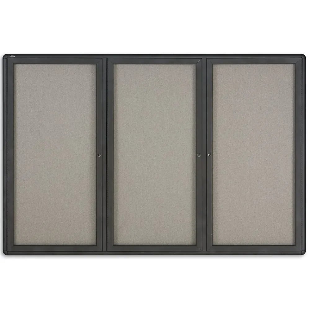Bring attention to important information with a display of pictures, documents, and more when you use this Quartet Radius 4′ x 6′ enclosed fabric bulletin board. Each board features durable gray fabric backed by high-density fiberboard that holds pins firmly in place and is enclosed in a sturdy aluminum cabinet with rounded corners and a graphite-finish frame. Three clear, shatter-proof, acrylic front doors lock to maintain visibility while preventing papers from getting lost or damaged, even in high-traffic areas.