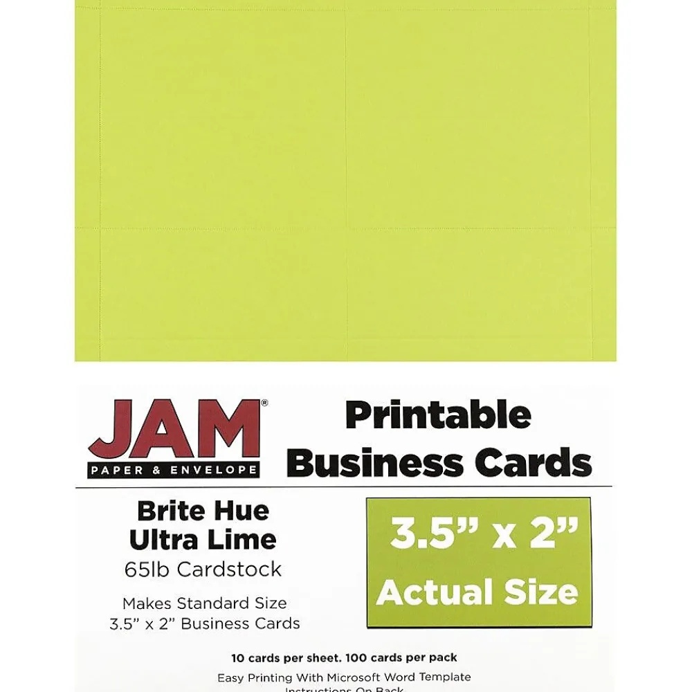 JAM Paper® Brite Ultra Lime Printable Business Cards are the perfect way to brighten up a person’s day as they learn about you and your business! These cards are made of 30% recycled 65lb cardstock and come in perforated sheets with ten cards in each. Ten sheets are included in each pack for a total of 100 cards! Each individual card is 3.5 x 2 inches is size. Entirely blank and printer friendly, these cards give you the freedom to represent your business in any way that you would like! Make your own business cards and eliminate the risk of having ordered business cards arrive with incorrect or obsolete information. This lime green color is certain to be the first one seen when those in need of your services are looking for a number to call!