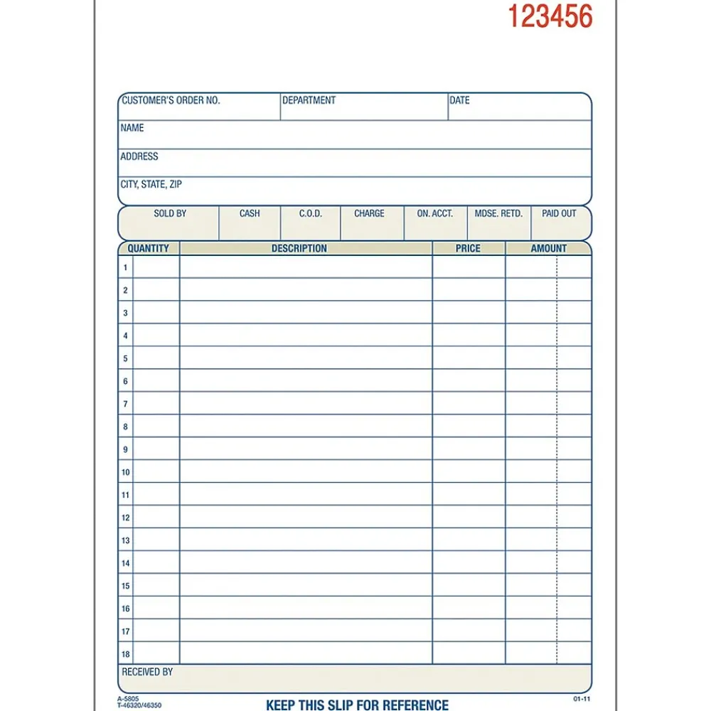 AdamsĀ® 2-Part sales order form book is numbered consecutively. Sales order form book is carbonless and has space at top for company stamp.