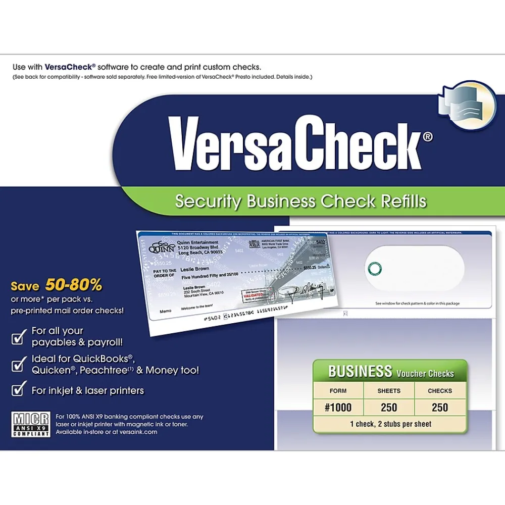 The VersaCheck Form No. 1000 Elite business voucher check refill is high-security blank check paper designed specifically to use with all VersaCheck software products (except personal versions) to print custom business checks that 100% comply with the ANSI X9 banking standards. Save up to 80% per pack compared to preprinted mail order checks. Each sheet measures 8.5″ x 11″ and includes one check on the top third of the page, and two stubs below, microperforated at 3.5″, 7″, and 10.5″ intervals from the top edge. This top-security business voucher check refill delivers high security standards, exceeding the counterfeit safeguard protection offered in most current banknotes. Security features include product-unique DNA-identifiable ink used to print the INKcrypt security stripe, a security QR code, a unique INKcrypt security code, invisible UV security marks, erasure protection, micro print lines, security screens, and artificial watermarks. Compatible with VersaCheck, QuickBooks, Quicken, MS Money, MAS90, MYOB, and more. This blank check paper offers extra storage security and the convenience of updating checking information at any time. For automated check clearing to comply with bank regulations, please use VersaInk or VersaToner in your inkjet or laser printer.
