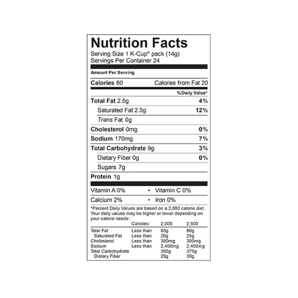 - Each K-Cup contains total fat (2.5 grams), protein (1 gram), total carbohydrate (9 grams), saturated fat (2.5 grams), sugars (7 grams), vitamin A, vitamin C, iron, sodium (170mg), calcium, and caffeine (10mg)