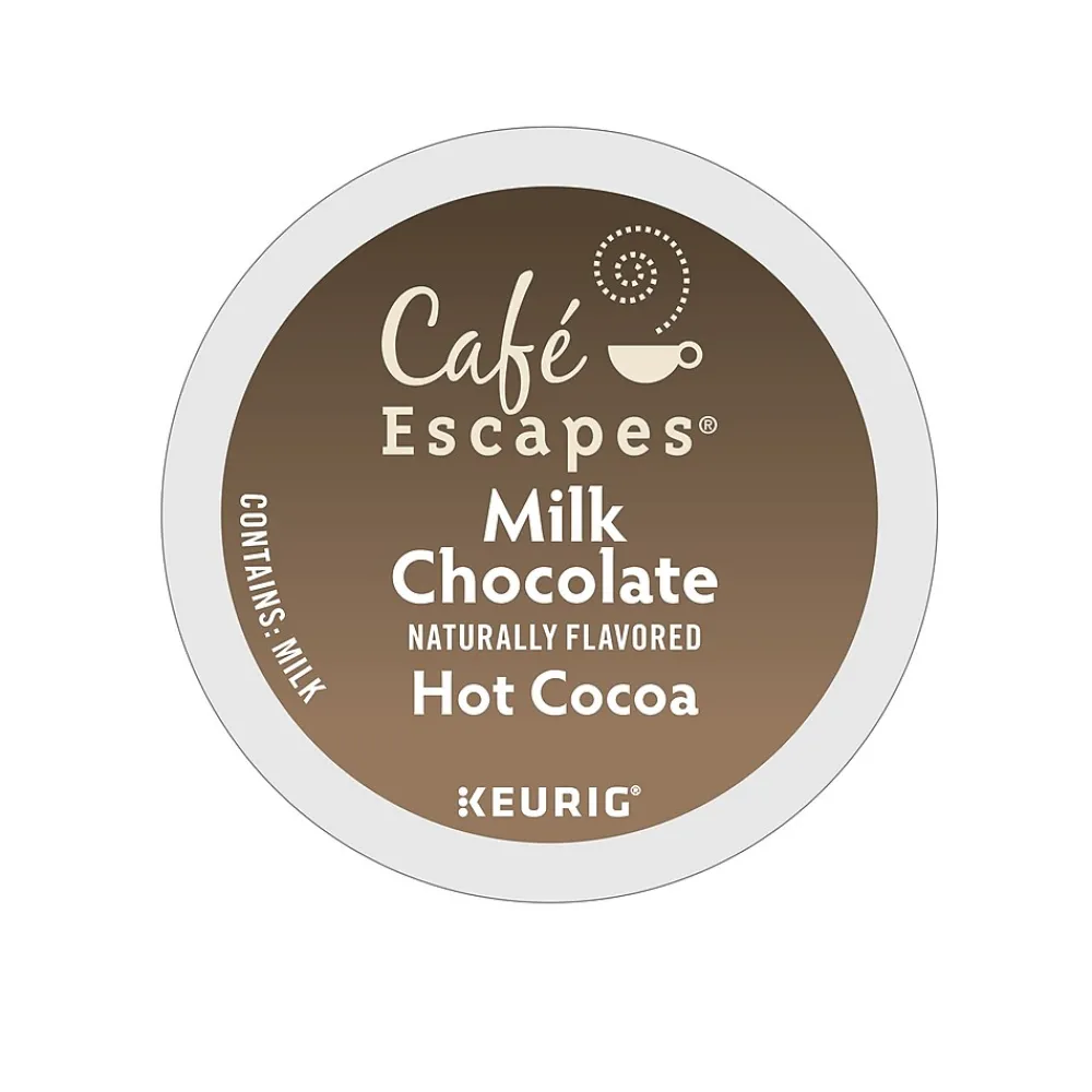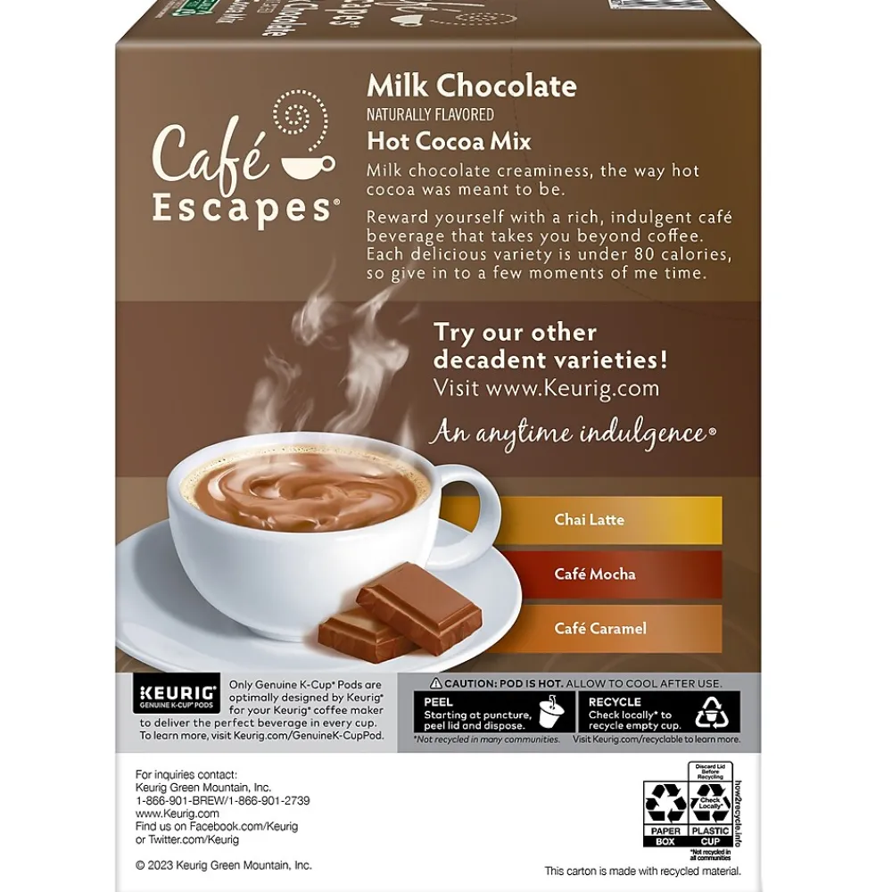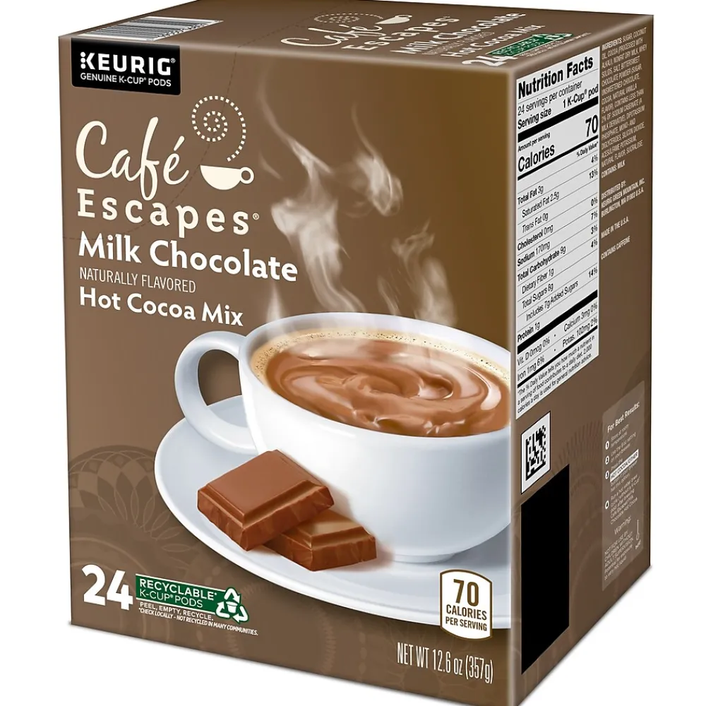 Provide your staff an alternative to coffee with this Keurig K-Cup Cafe Escapes milk chocolate hot cocoa 24-pack. Individual pods eliminate mess in the break room or coffee area, letting employees and visitors make one rich, creamy cup at a time. Containing just 10 milligrams of caffeine per cup, this Keurig K-Cup Cafe Escapes milk chocolate hot cocoa delivers a smooth mid-morning change from highly caffeinated beverages.