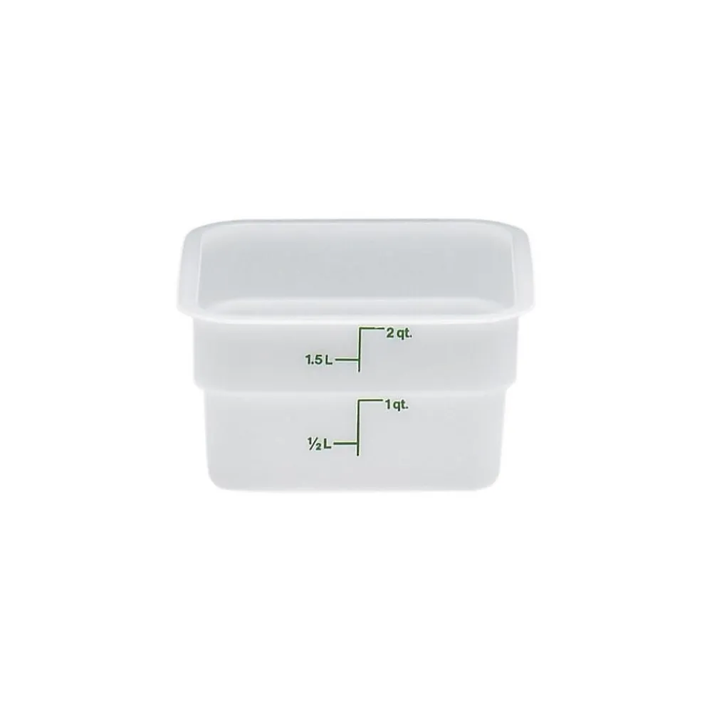Safely store your products with this Cambro 2SFSP148 2 Qt.. square food storage container! This food storage container is made of impact resistant solid white plastic that won’t be stained or harmed by food acids, oils, and alcohol. Thanks to its square shape, this container can be conveniently packed onto shelves without wasting space, while its easy-to-read kelly green-colored gradations allow you to manage your inventory at a glance. This square container can withstand temperatures from -40 to 210 degrees Fahrenheit, ensuring its safe use in both refrigerators and freezers.