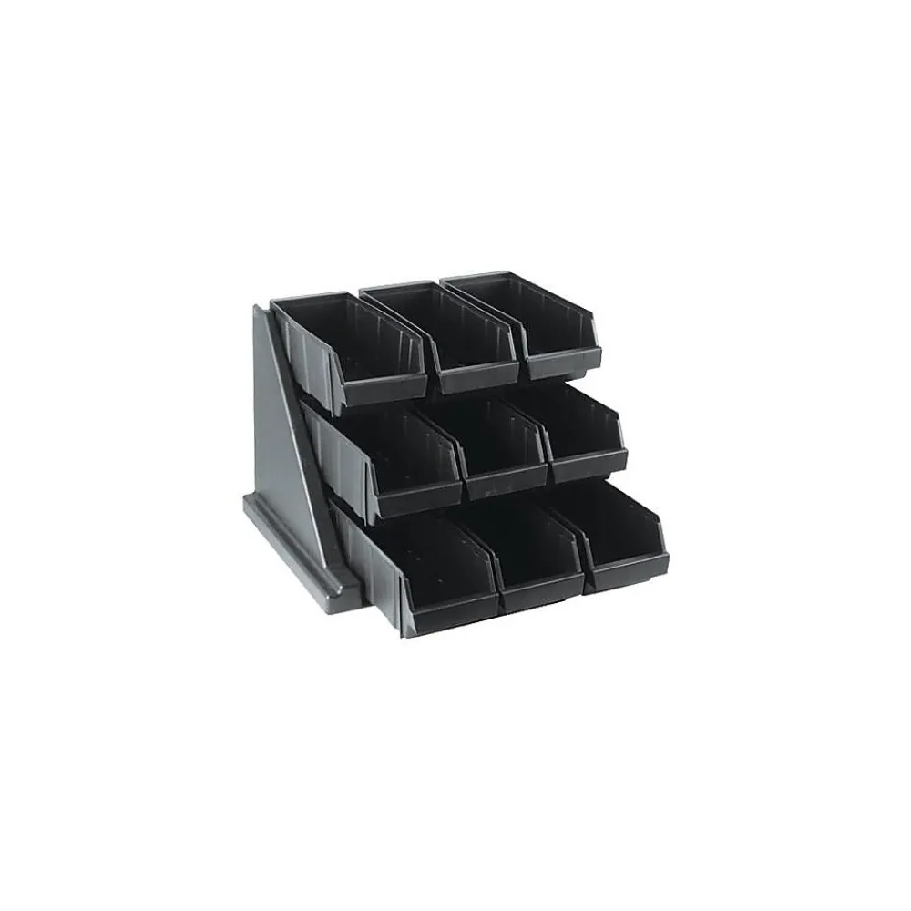 Keep your condiment packets, disposable utensils, napkins and other countertop service items in order with this black 9-bin Versa organizer rack. Its three rows of three bins each are easily assembled, and it can be used either on a flat surface or mounted on a wall (each bin will hold up to 10 lbs). This organizer rack is made of durable polymer plastic with a one-piece, seamless design that is easy to clean.