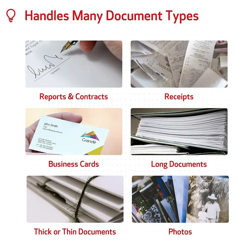 - Reliably handles many different document types: Receipts, photos, business cards, reports, contracts, long documents, thick or thin documents, and more
