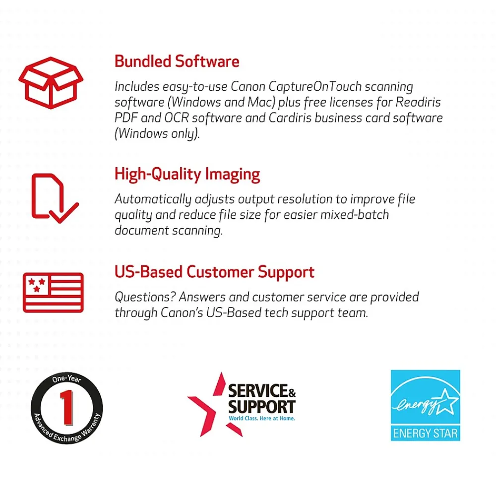 - Bundled software: Includes easy-to-use Canon CaptureOnTouch scanning software (Win and Mac) plus free licenses for Readiris PDF and OCR software and Cardiris business card software (Win)