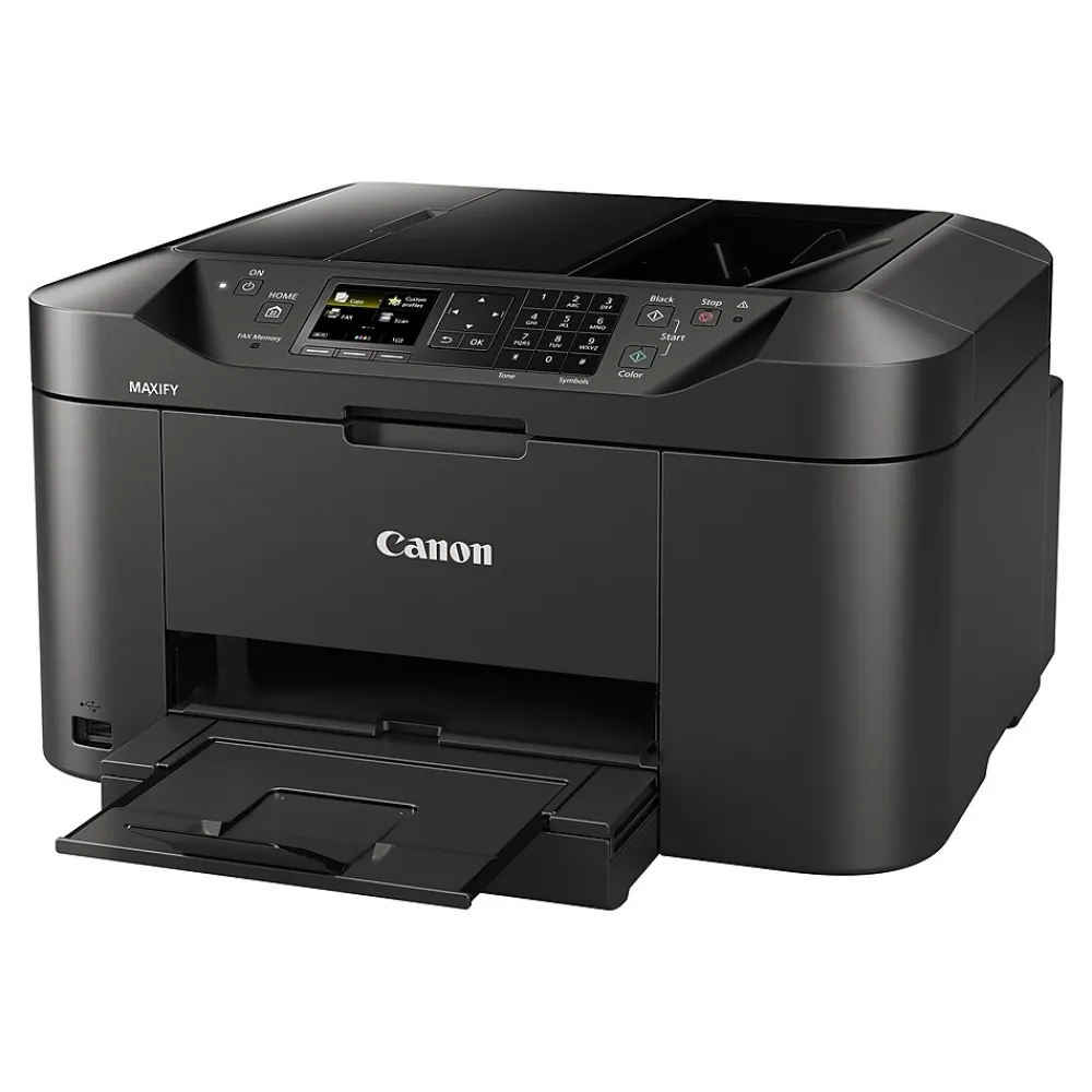 Produce sharp, detailed documents, scan stacks of records, and make accurate copies with this MAXIFY multifunction color inkjet printer. Featuring wireless LAN and Ethernet connectivity, this device lets you print from and scan to mobile devices via cloud printing services and easily integrates into office networks. High-precision inkjet printing technology delivers a maximum print resolution of 600 x 1200 dpi and enhances presentations with vivid color and sharp, detailed images. Boasting print speeds of up to 24 black and white pages per minute, this machine easily keeps up with office printing needs. A built-in flatbed scanner with an optical resolution of up to 1200 x 1200 dpi captures documents in sharp detail, perfect for digitizing important records. This Canon MAXIFY printer lets you print directly from flash drives and other storage media with a high-speed USB port.