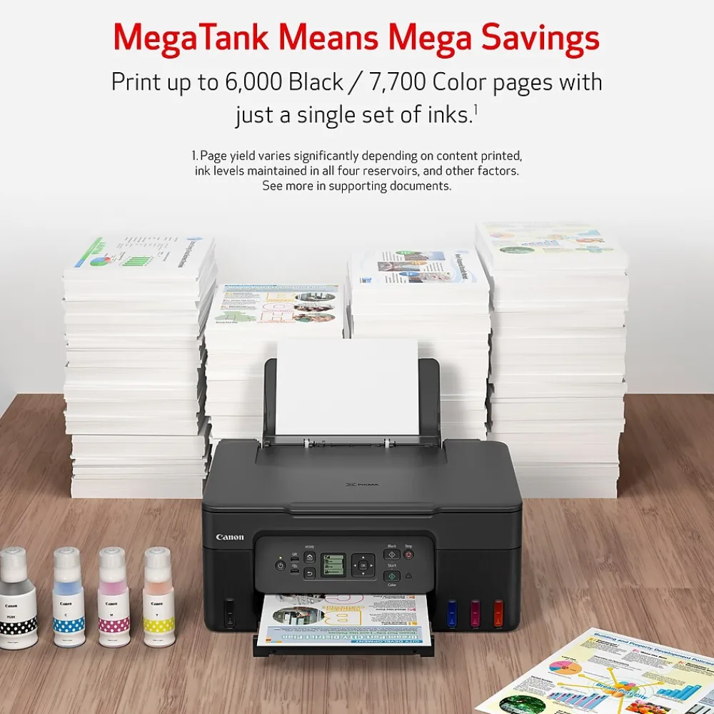 Experience exceptional performance and versatility with the Canon PIXMA G3270 MegaTank Wireless Color All-in-One Printer. Perfect for home and home office use, this borderless inkjet printer offers remarkable wireless connectivity and an impressive print resolution of 4800 DPI. The hybrid ink system ensures sharp black text and vibrant colors on various media types, including envelopes, high-resolution paper, recycled paper, and semigloss photo paper. Create stunning borderless photos up to 8.5″ x 11″ and enjoy a convenient paper capacity of up to 100 plain sheets or 20 photo sheets (4″ x 6″). Rapid print speeds combined with four-color pigment-based ink system provide crisp and eye-catching documents. Stay connected with hi-speed USB and print effortlessly from computers or mobile devices for a seamless printing experience. Upgrade your productivity with the Canon PIXMA G3270 MegaTank wireless Color All-in-One Printer today.
