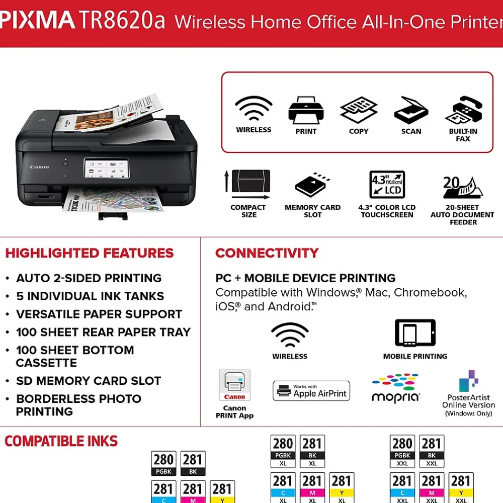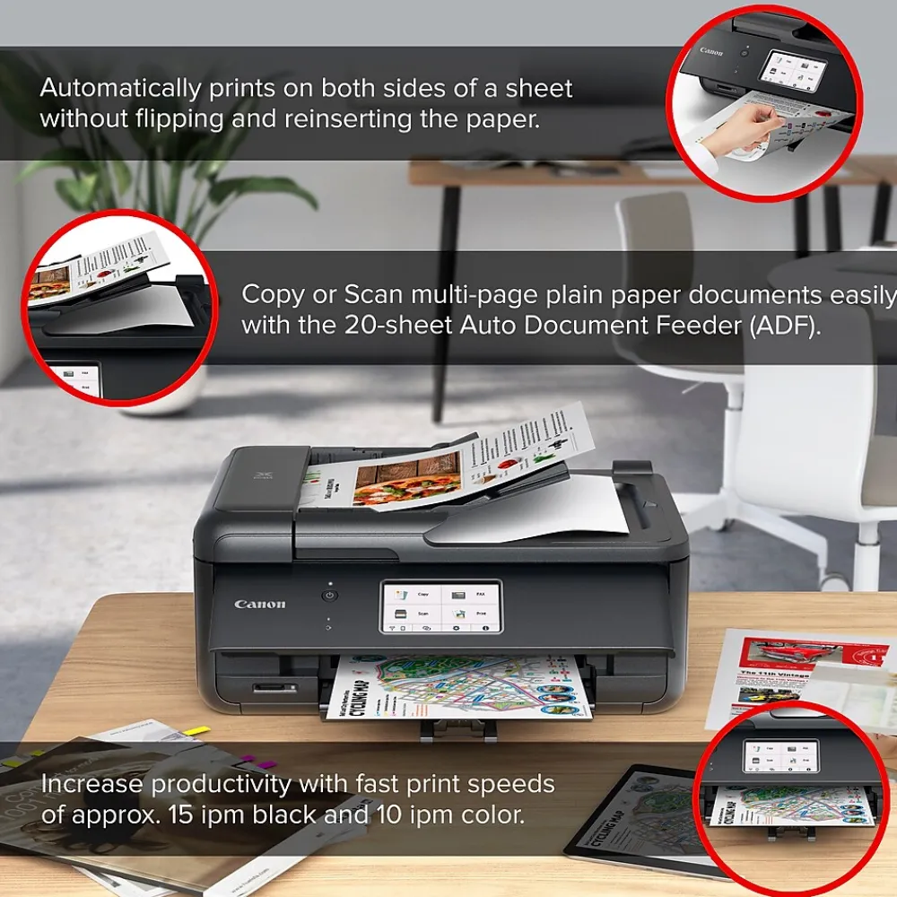 When you need a compact home office printer that can handle all your work needs, the Canon PIXMA TR8620a has you covered. With front and rear paper feeding, an individual ink system, 4.3″ LCD touch screen, and impressive wired and wireless connectivity options, you’ll be able to do it all. The PIXMA TR8620a can easily transition from scanning a multipage contract with the built-in auto document feeder to printing double-sided homework assignments from online classrooms systems, or a family photo wirelessly from your smartphone. Whether it’s printing documents and reports, or faxing and scanning, the PIXMA TR8620a is the ultimate compact home office printer that’s big on performance and productivity.