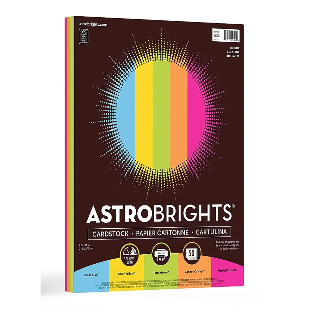 Let your imagination take off with Astrobrights colored cardstock, in Bright 5-Color Assortment. Creative geniuses and novices alike can create flyers, invitations, presentation covers, scrapbooking, school projects and DIY paper crafting. Display and store projects with confidence, since each sheet is lignin and acid-free. Plus, this cardstock works well with copiers, inkjet, and laser printers. Astrobrights cardstock is also compatible with electronic cutting machines so you can create intricate letters, shapes and other designs. Save money on pricey full-color ink – just add black ink! Brighter Colors. Brighter Ideas.