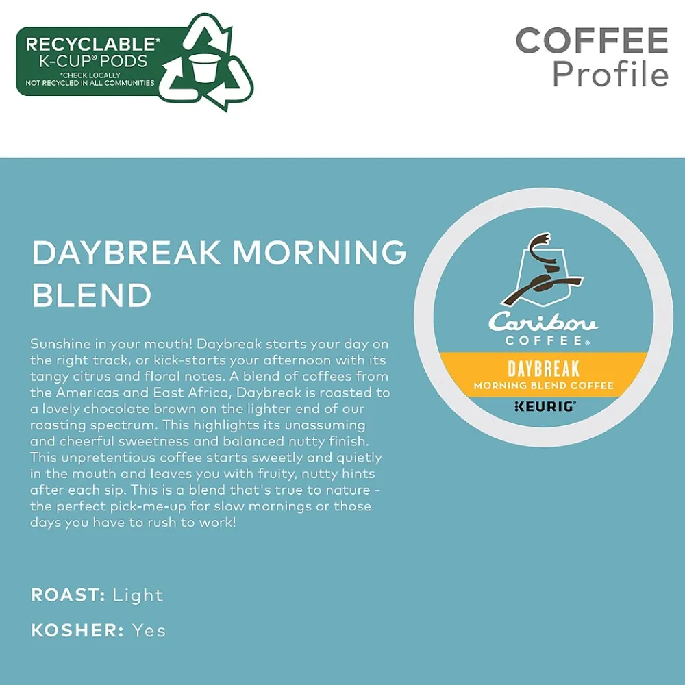 Face the day with confidence when sipping this single-serve Morning Blend coffee. Designed for Keurig machines, the eye-opening coffee combines Costa Rican, Guatemalan, Columbian, and Ethiopian coffee beans for a subtle richness and complex flavor. Enjoy the light, fruity taste and smooth finish of this 24-pack of Caribou Coffee K-Cups.