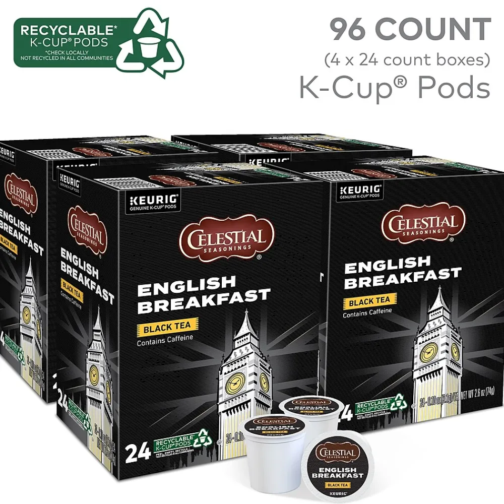 Give office staff or visitors an alternative to coffee with these English Breakfast tea pods. Black teas and just the right hint of floral notes give this hot beverage smooth, delicious flavor, and each pod brews a single serving without the need for steeping or boiling water. These Keurig K-Cup Celestial Seasonings tea pods work with Keurig brewing machines, making it easy to prepare your morning cup of tea.