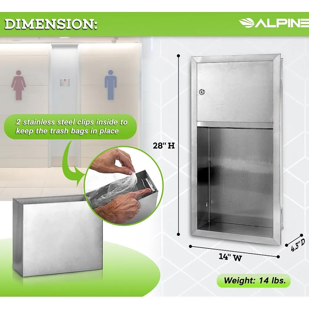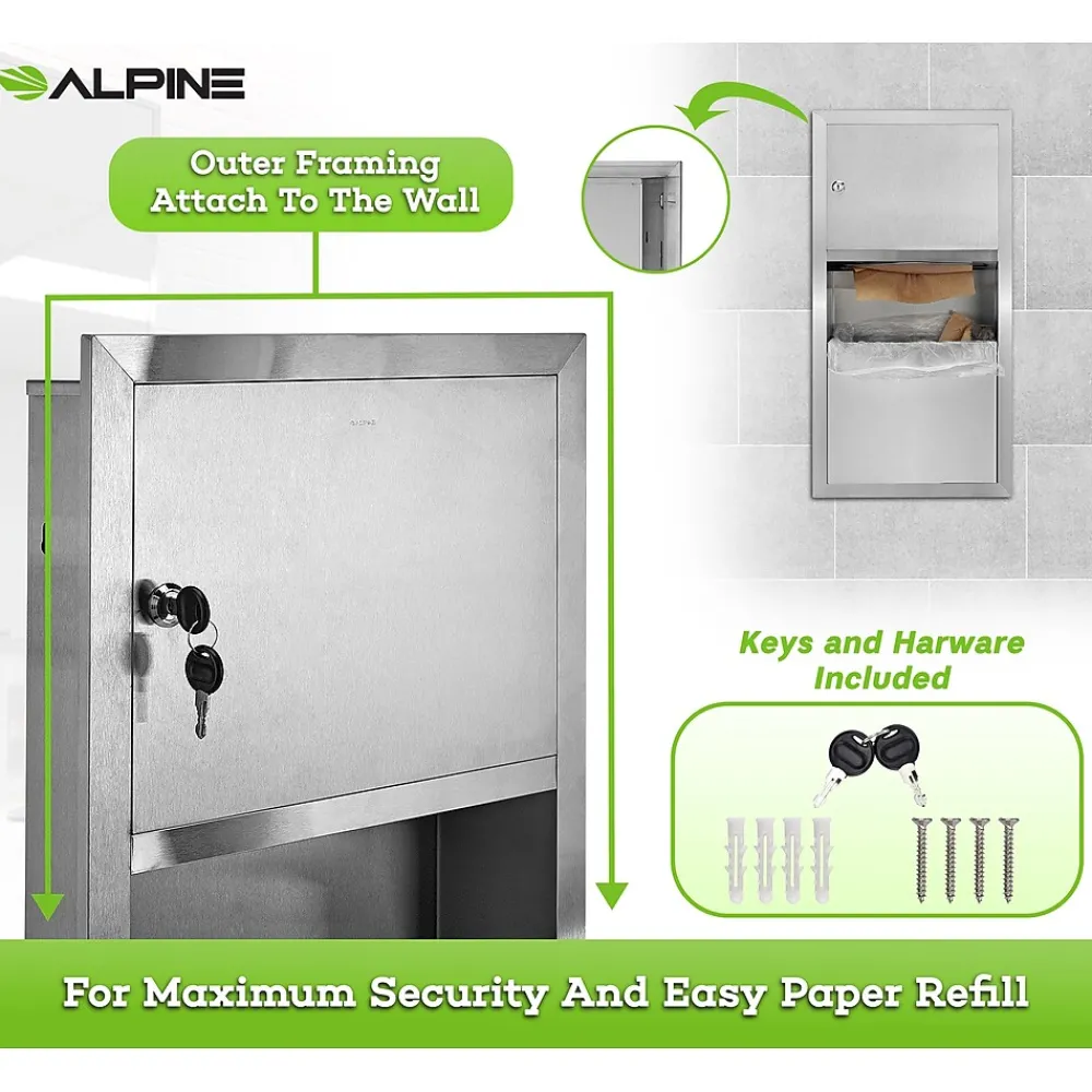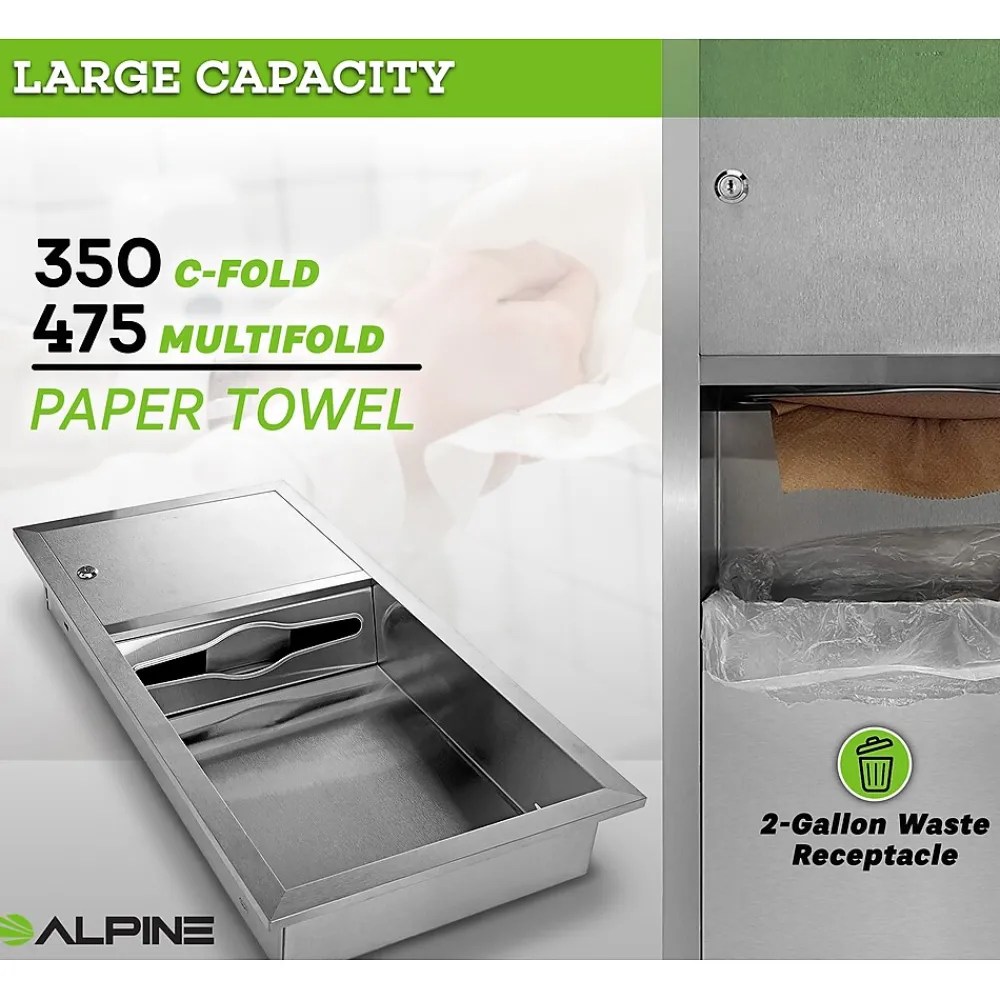 Alpine Industries recess mounted Paper Towel Dispenser with Waste Receptacle is both sleek and clean in appearance, with an elegant satin-finish. Our Dispenser Waste Receptacle is crafted from heavy duty stainless steel, making it durable and corrosion resistant. You’ll have zero issues saving space and making sure that waste management in your facility is up to the task. Attached is a leak-proof 2-gallon waste container, which is ideal for high traffic areas like public bathrooms or other commercial bathrooms. Each door is furnished with a tumbler lock key to prevent unauthorized access and accidental spillage. The dispenser also features a rounded towel tray with a hemmed opening, preventing the tearing of paper towels. The waste receptacle is removable for easy cleaning and maintenance. Holds up to 350 C-fold or 475 multifold paper towels.