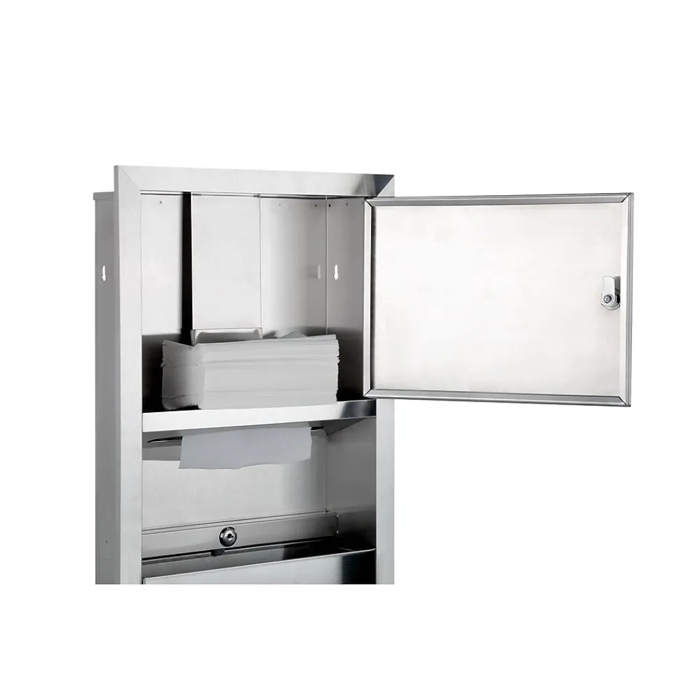 - Quick install in any restroom in-wall recessed mountable paper towel dispenser with trash receptacle