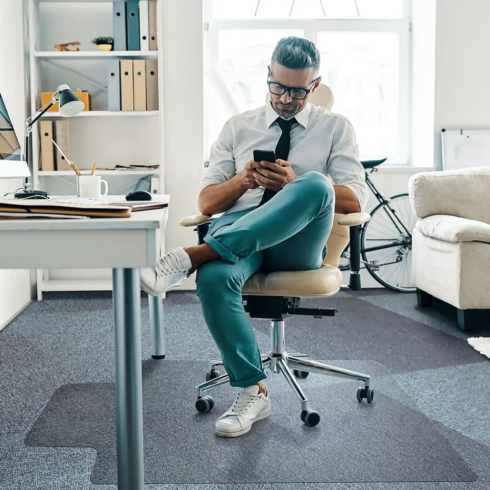 These high clarity chairmats for carpeted flooring are made from Floortex Original polycarbonate, which has double the impact strength of PVC and will not crack, curl, discolor or smell. The perfectly flat and hard surface provides easy glide movement of caster based chairs which can reduce leg fatigue and lower back strain. Ultimat is environmentally safe, free from Phthalates, PVC and toxic chemicals. An ideal choice for people with allergies. Eco-friendly manufacturing with 50% of our manufacturing site’s energy coming from on-site and external renewable sources. 100% recyclable. Our polycarbonate mats lie perfectly flat from delivery and can be used immediately.