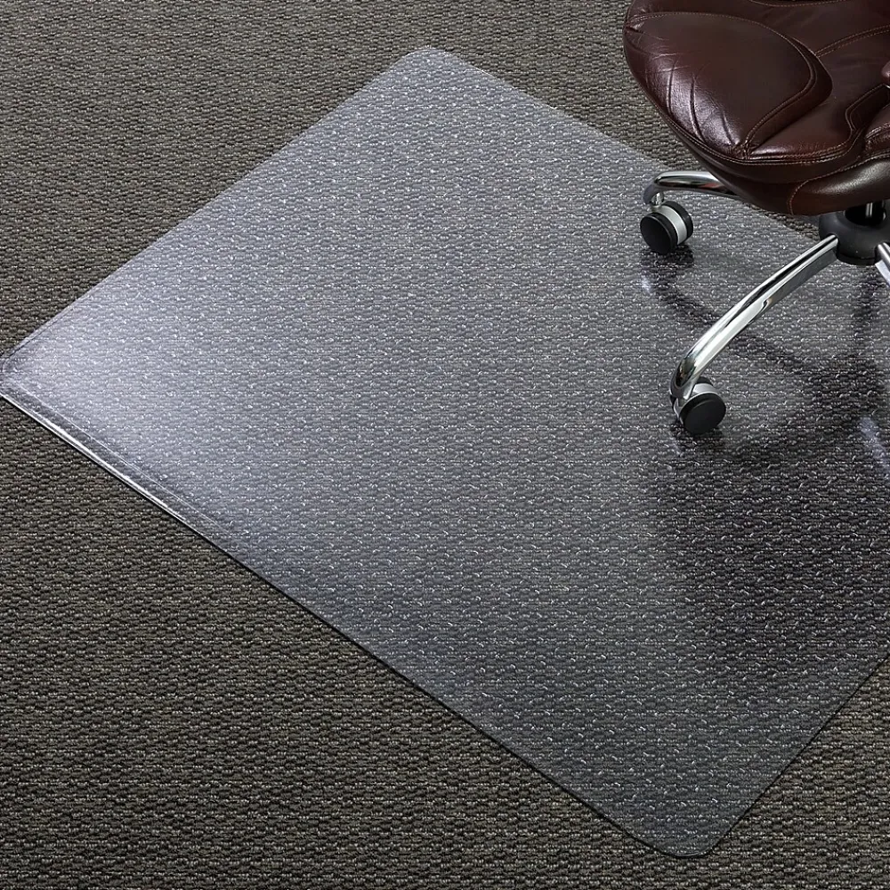 Extend the life of your flat to low pile carpet (up to 1/4″ thick including padding depth) by protecting against chair caster wear and tear. The perfect addition to your workspace, this chair mat provides a smooth surface that enhances ergonomic comfort by allowing your rolling office chair to move freely. Easy to handle, this chair mat features rounded AnchorBar cleats (studs) that hold your mat in place and are gentle on carpets and fingers (no sharp spikes). This chair mat is made with durable vinyl that is GREENGUARD Gold Certified for low chemical emissions to promote a healthier workspace. Designed for use on carpeted surfaces only, do not use on hard floors.