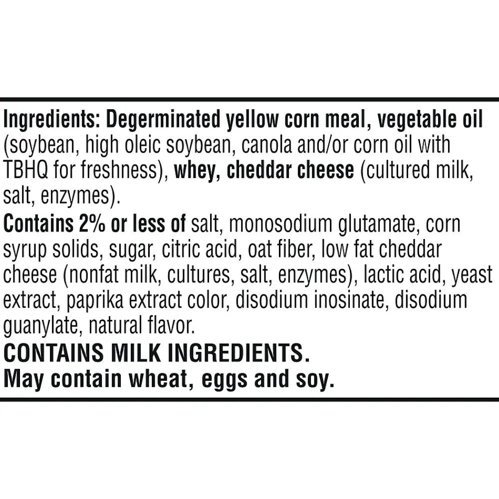 - Ingredients: degerminated yellow corn meal, vegetable oil (soybean, high oleic soybean, canola and/or corn oil with TBHQ for freshness), whey, cheddar cheese (cultured milk, salt, enzymes), contains 2% or less of salt, monosodium glutamate, corn syrup solids, sugar, citric acid, oat fiber, low-fat cheddar cheese (nonfat milk, cultures, salt, enzymes), lactic acid, yeast extract, paprika extract color, disodium inosinate, disodium guanylate, natural flavor