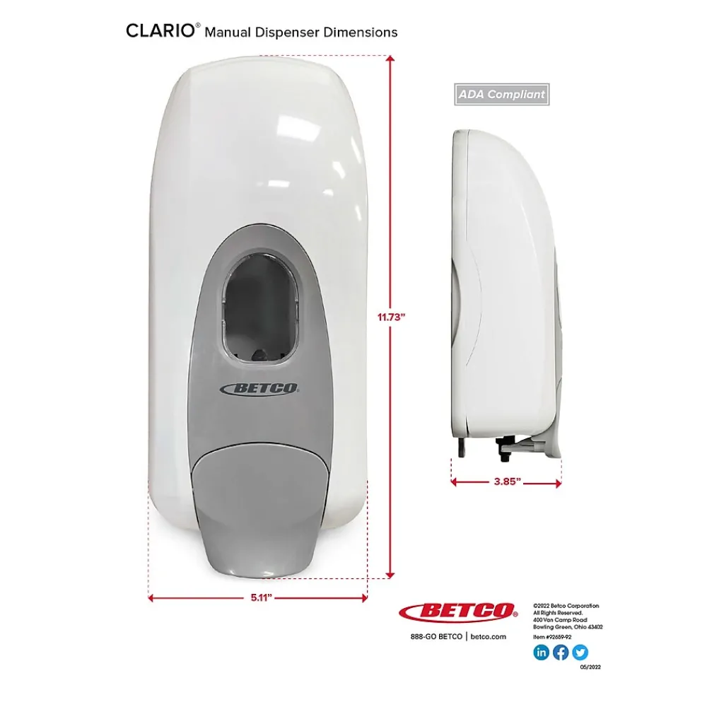 - Compatible with Betco Refill models 7962900 (Gel Hand Sanitizer), Clario model 1412900 (Soap), Clario model 7832900 (Soap), Clario model 1122900 (Soap)