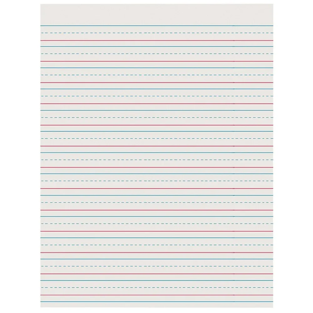 - 1/2″ ruled on both sides with 1/4″ blue dotted midline, red baseline and 1/4″ skip space