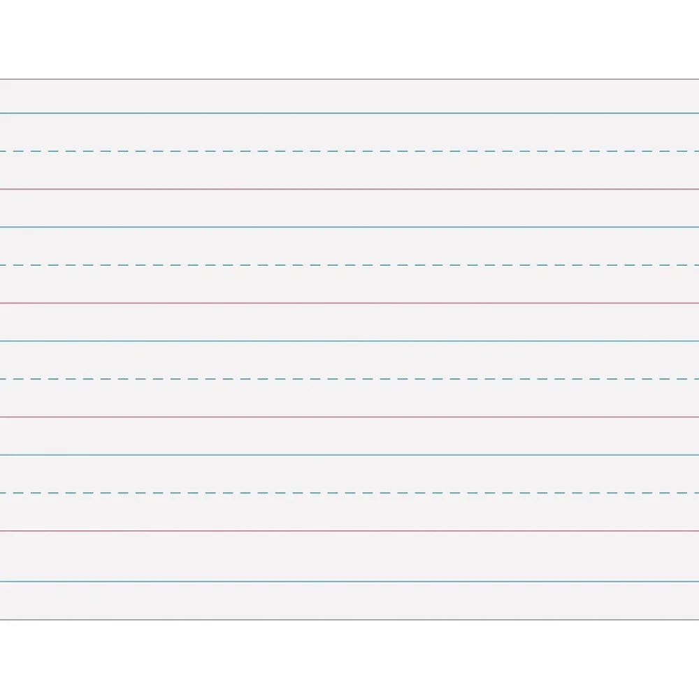 - Bright tablet paper ruled both sides with red baselines, blue dotted midlines and blue headlines