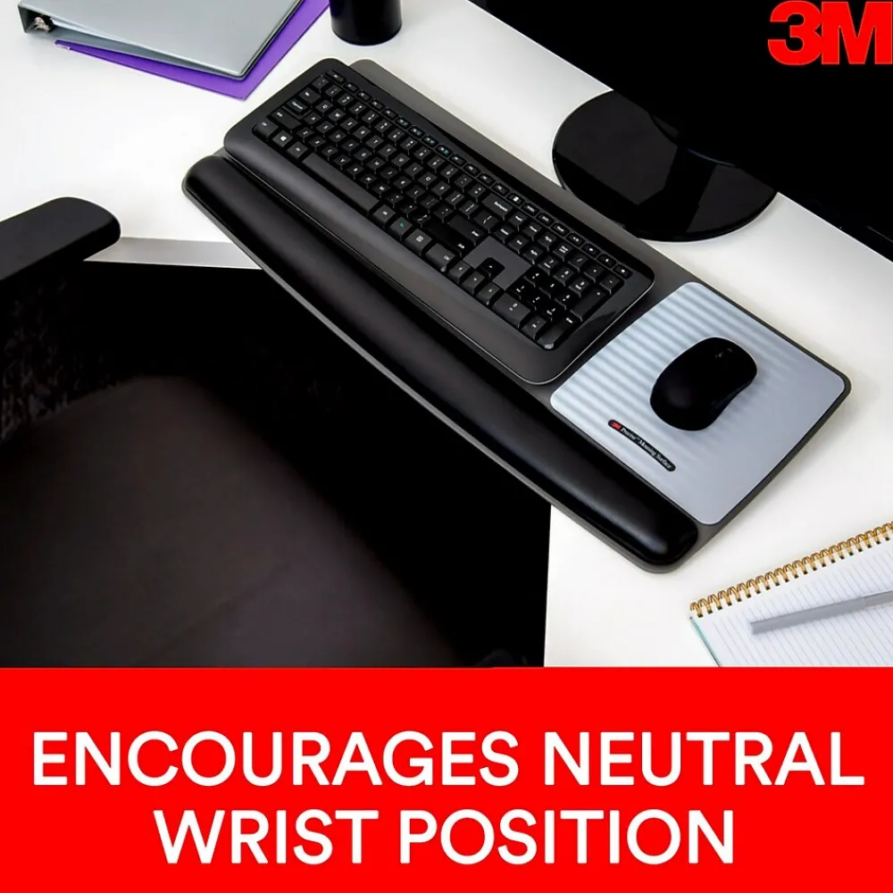 3M Gel Wrist Rest for Keyboard and Mouse has a tilt adjustable platform for comfort and keeps keyboard and mouse in place.