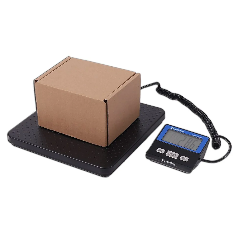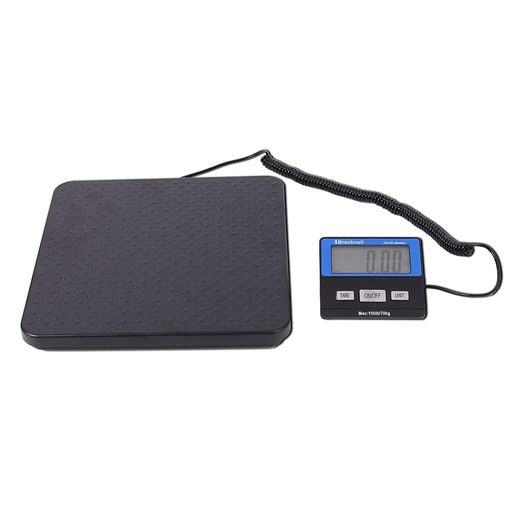Weigh parcels up to 150-pounds with this robust, hard-wearing ribbed die case base scale that is well-suited for warehouses or commercial shipping. A coil-style display cable on this scale provides easy extension to a nearby mounting surface for public visibility. This Brecknell digital parcel scale has large keys, so employees wearing thick gloves can operate it easily.
