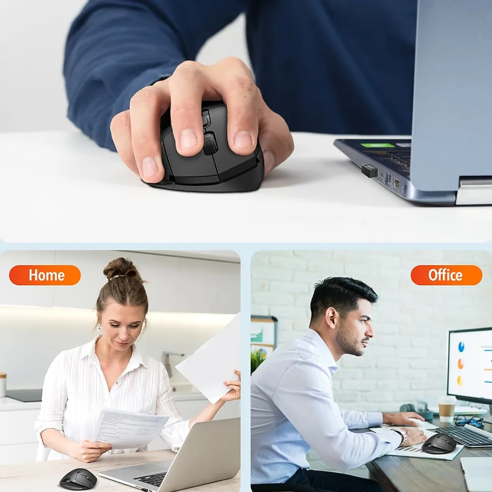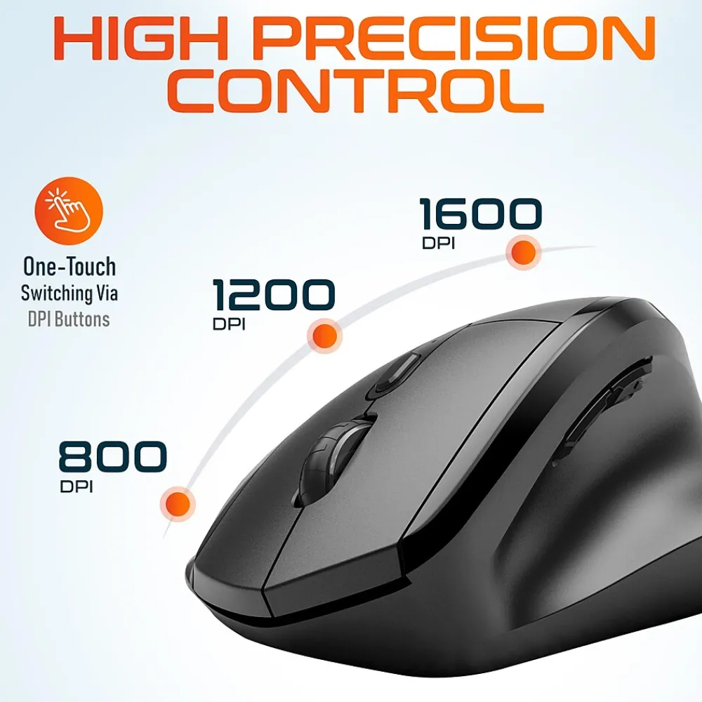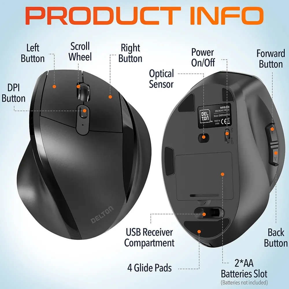 Maximize comfort and precision with the Delton S30 ergonomic mouse. This wireless USB mouse is designed to be comfortable even for larger hands and is medically recommended to promote healthy hand posture. The mouse features ultra-glide pads for fluid cursor movement and offers a robust 2.4GHz wireless connection compatible with Windows, macOS, and iOS. This wireless mouse has an auto-pair USB dongle for easy connectivity, a high-precision optical sensor for accurate tracking, and three adjustable dpi settings to suit various tasks. Enjoy seamless document and web navigation with the smooth-glide scroll wheel, and benefit from the whisper-quiet buttons for a peaceful workspace. The S30 vertical mouse includes a compartment for secure dongle storage and intuitive side buttons for efficient navigation. The mouse is engineered for low energy consumption with an auto-sleep feature. Powered by just two AA batteries for extended use, the S30 ergonomic wireless mouse is perfect both for professional and personal use.