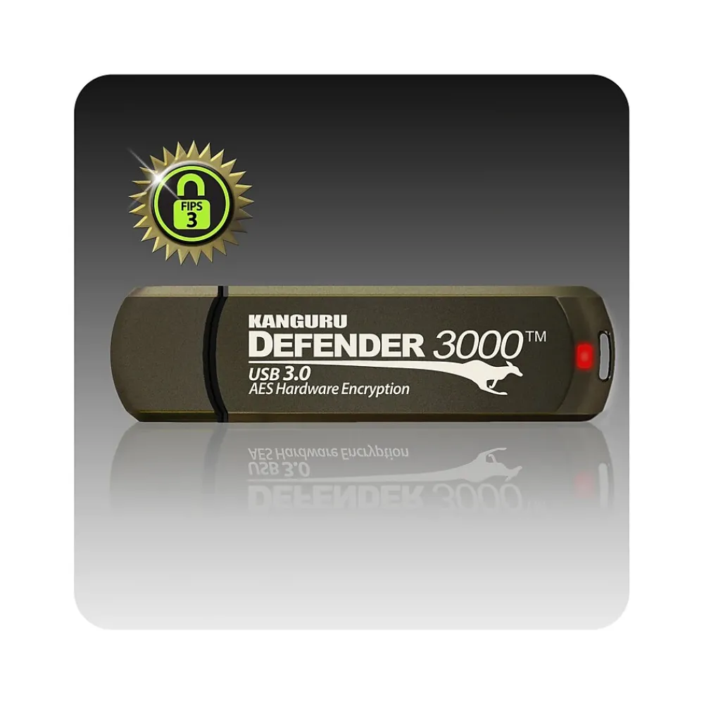 The Kanguru Defender 3000 is the fast, secure, military-grade, hardware encrypted flash drive. Designed to address the demanding encryption standards, this Superspeed USB 3.0, FIPS 140-2 Certified, AES 256-bit hardware encrypted flash drive is perfect for keeping sensitive government, financial or corporate information highly secure. This Kanguru Defender 3000 combining high-level security with ultra-fast USB 3.0 (USB 3.2 Gen 1X1) speed and FIPS 140-2 Level 3 certification. It includes robust antivirus by Award-Winning Bitdefender, and tamper-resistant protection, as well as remote management capabilities and TAA Compliance for the most comprehensive data protection solution available in a hardware-encrypted flash drive. Furthermore, all Kanguru Defender secure FIPS 140-2 flash drives are fully protected from the potential risks associated with “BadUSB”. The secure memory stick proves unequivocally that it meets and surpasses the most stringent federal, healthcare and financial industry security regulations in the world.