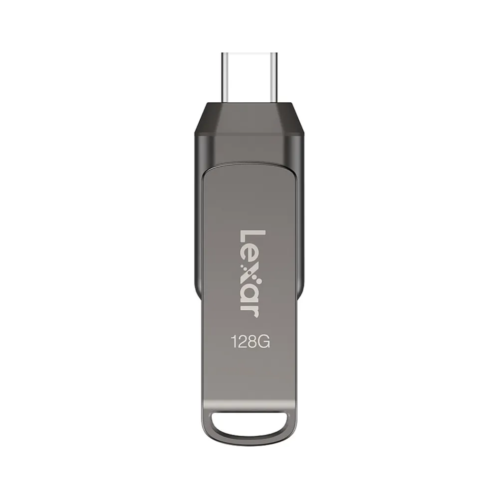 The Lexar JumpDrive D400 is a two-in-one flash drive that allows you to seamlessly transfer content between your USB Type-C and Type-A devices. Featuring a stylish metal casing and swivel design for added protection, this drive is as tough as it is fast, with transfer speeds up to 130MB/s.