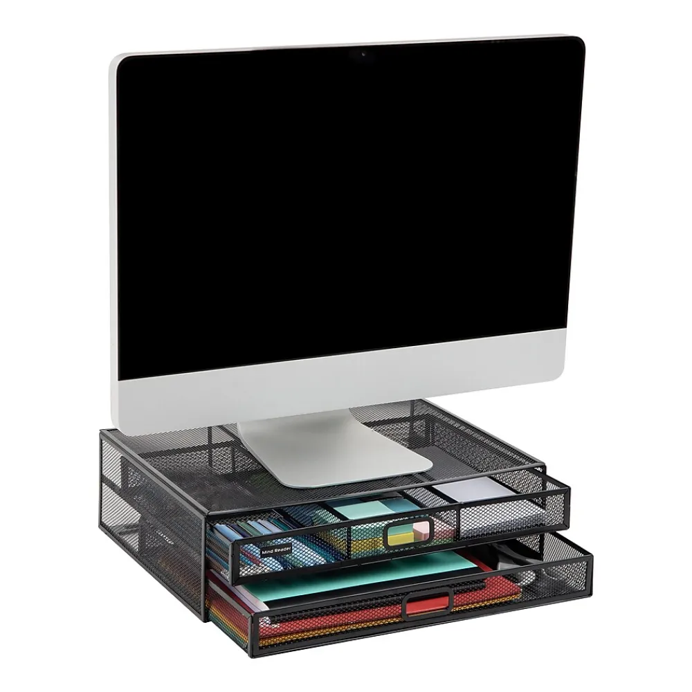 Enhance your workspace with our two-tier desktop organizer and monitor stand. Capable of holding up to 40 lbs. (18.1 kg), it’s perfect for securely supporting desktop electronics such as laptops, notebooks, monitors, printers, and can even double as a TV stand.The organizer features a durable metal mesh construction, which ensures that it withstands daily use. Non-slip grips on the bottom of the stand keep it firmly in place, ensuring your items stay secure and stable. Weighing in at just 4.4 lbs. (2 kg), it’s also extremely portable and can easily be moved to wherever you need it.Maximize your organization capabilities with two tiers of drawers. The top tier is ideal for storing files, folders, and other important documents, while one of the pull-out drawers features three separate compartments for storing office essentials like pens, pencils, and paper clips. The see-through design lets you quickly locate what you need.This desktop organizer is a great addition to your office setup and blends in perfectly with the rest of the Network Collection. It also makes an excellent gift for graduations, birthdays, holidays, and other special occasions. Boost your productivity and keep your space tidy with this versatile desktop organizer.